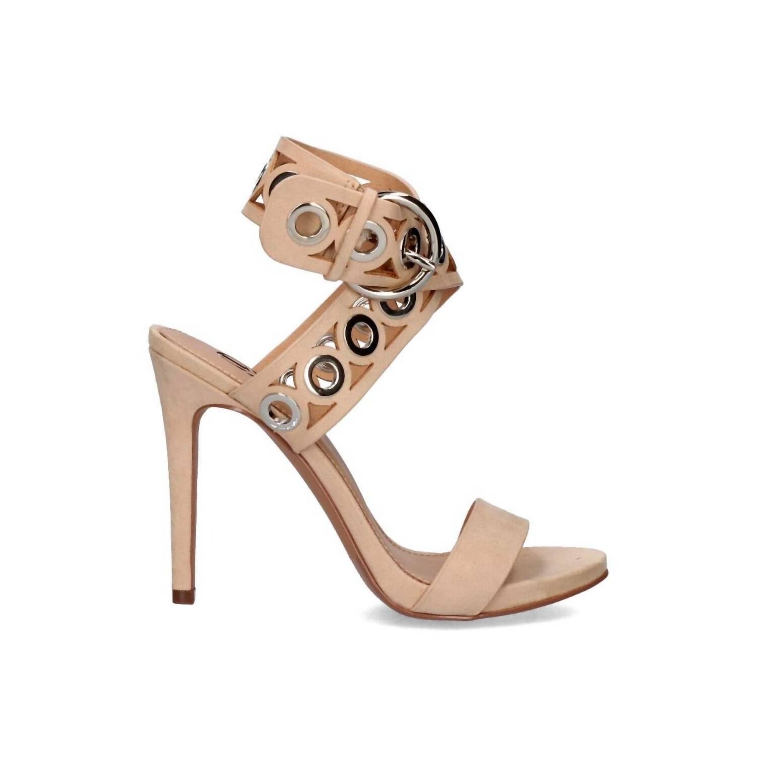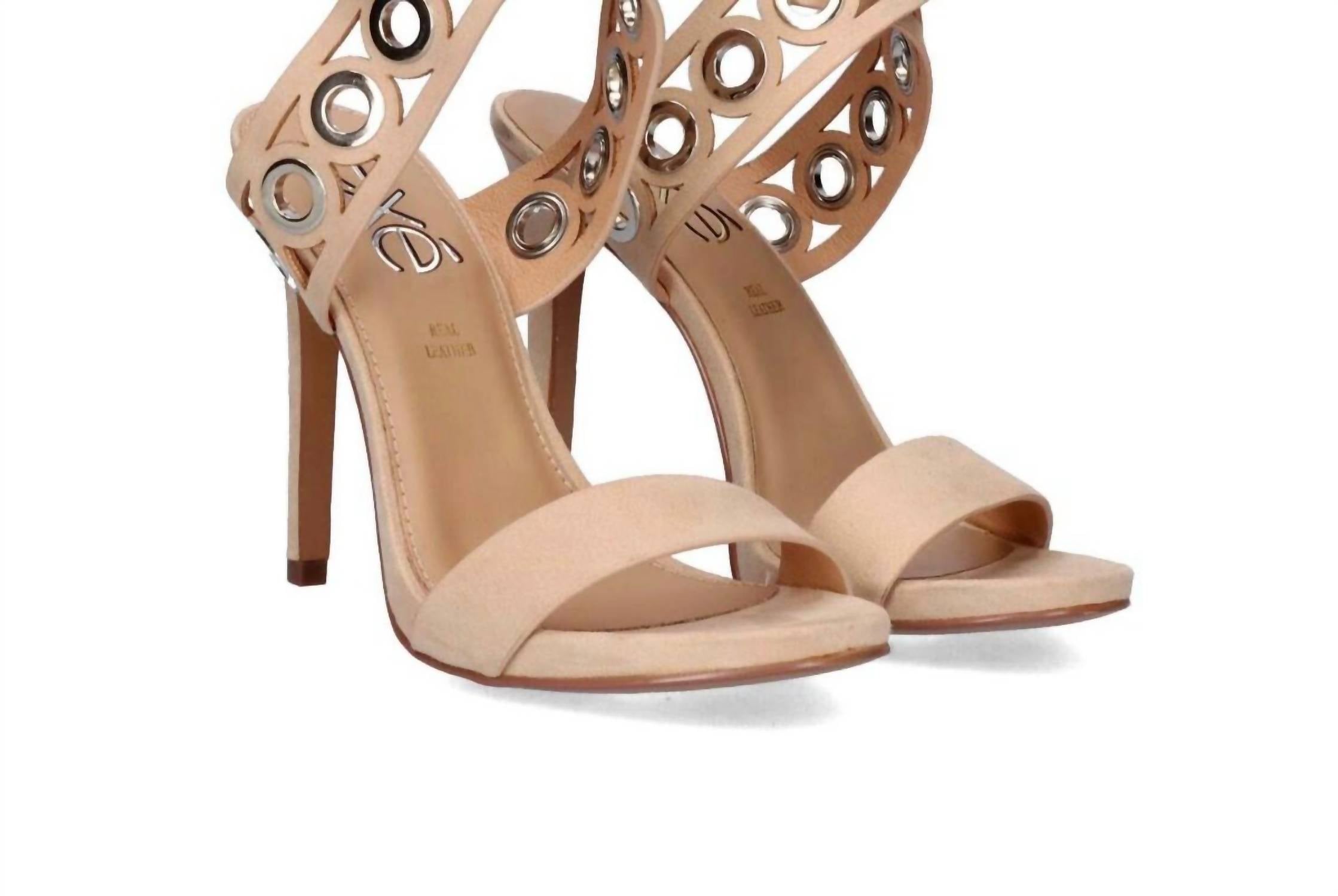 Flowy dresses, cropped pants, and even jumpsuits... this sandal works with them all! Step into summer elegance with the Women's Silvia-224 High Heels by Exe, perfect for engagement occasions. Featuring a stiletto heel and a chic peep-toe design, these beige sandals are crafted from high-quality synthetic material for durability and style. The ankle boasts two straps adorned with silver metallic decorations that crisscross, fastening with a silver buckle for a secure fit. Ideal for those seeking quiet luxury, these sandals seamlessly blend sophistication and modern allure.