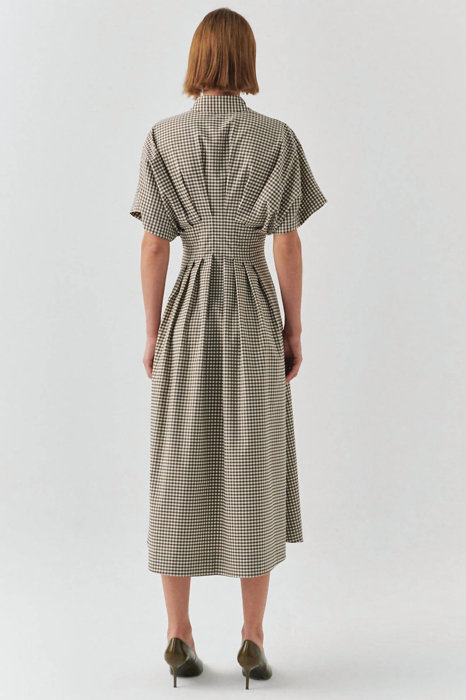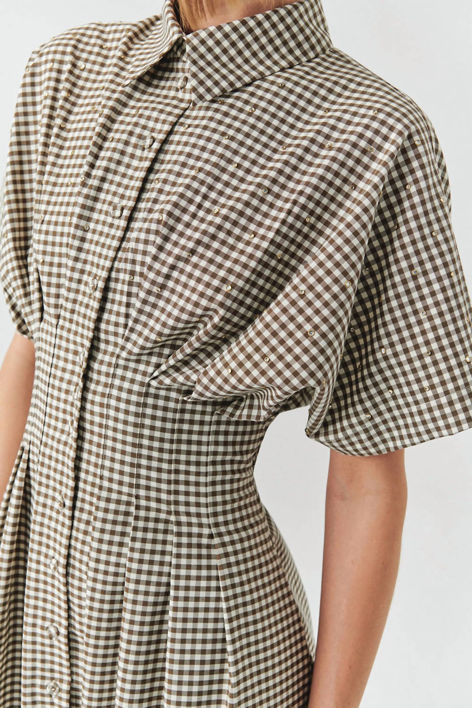A midi dress so versatile, your options for wearing it are endless. Step into timeless elegance with the Dream Short Sleeve Dress by EXQUISE, perfect for any holiday party. This cream-mink gingham midi dress features a classic collar and A-line silhouette, combining vintage trends with modern flair. Made from a comfortable cotton blend of 67% Cotton, 31% Polyester, and 2% Elastane, it ensures effortless style and ease with its practical button closure and handy pockets. Care instructions recommend not washing to maintain its pristine look.