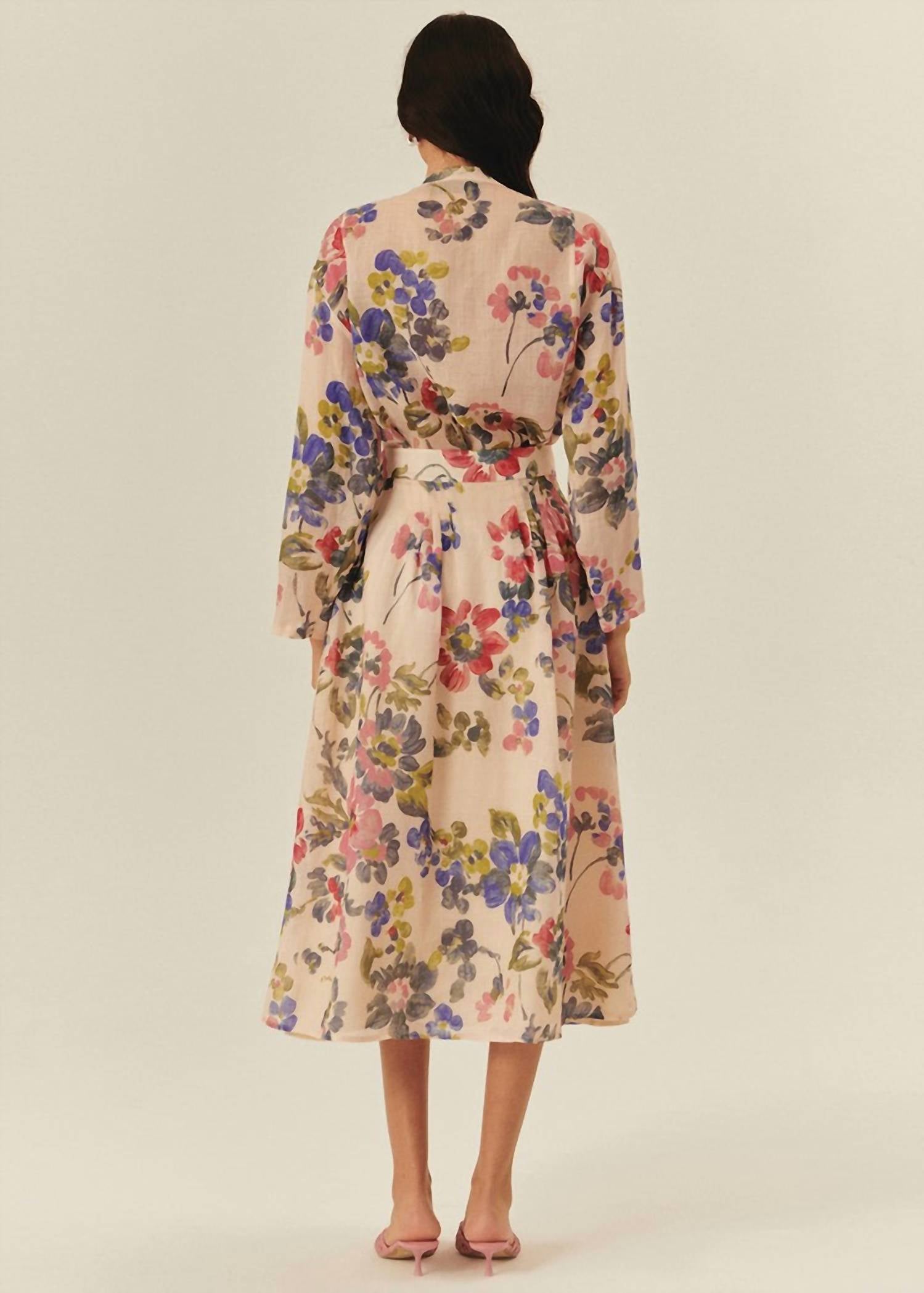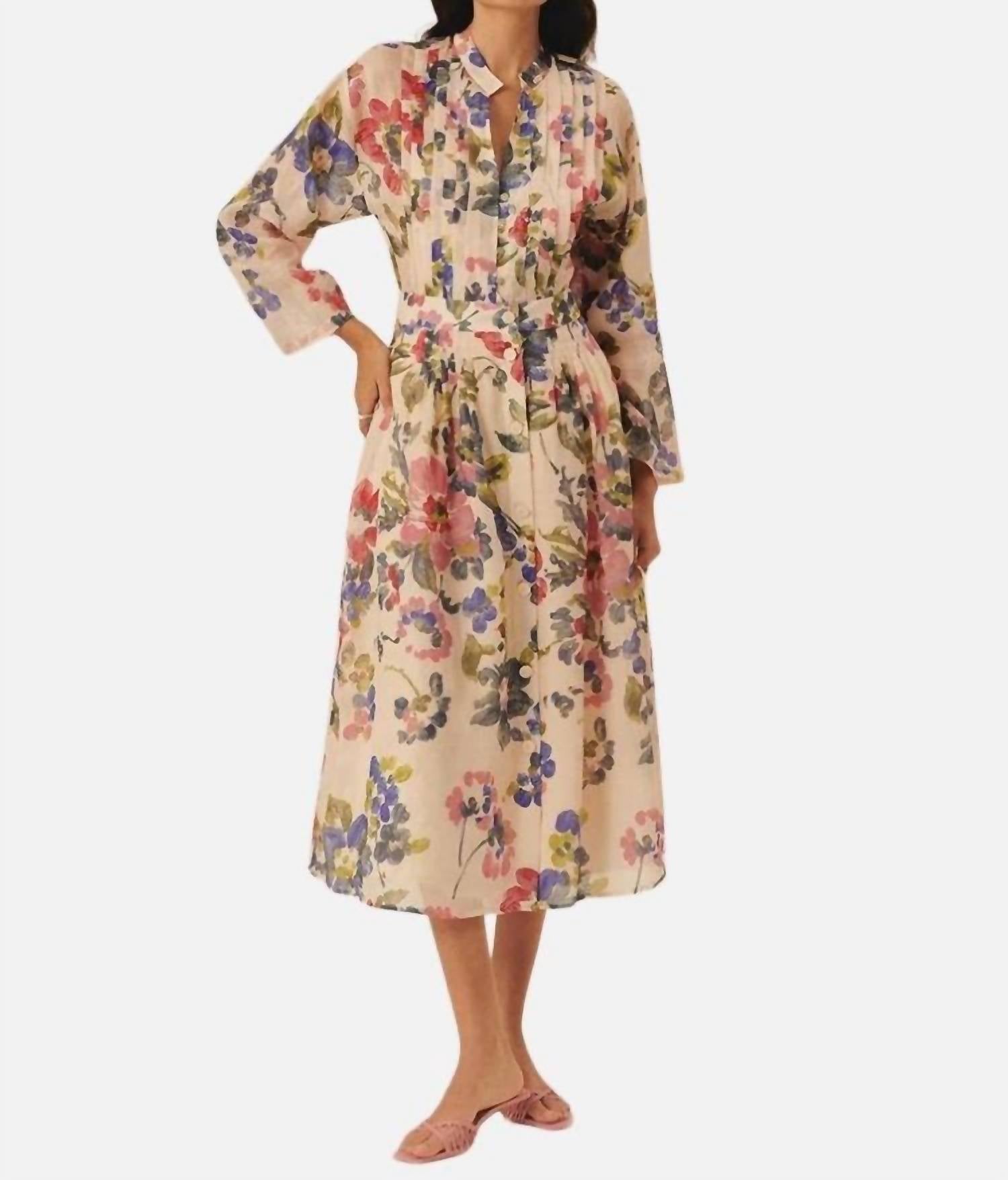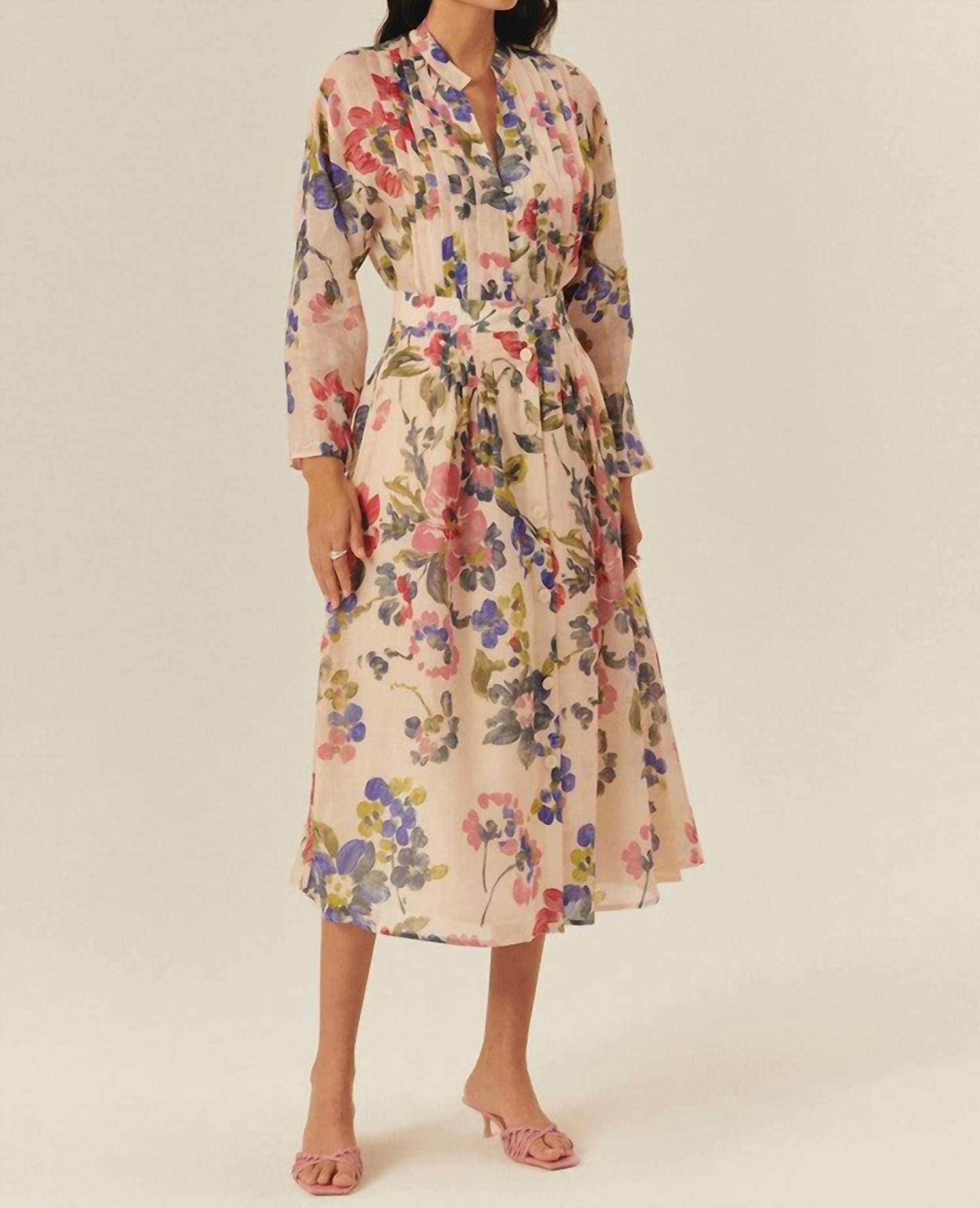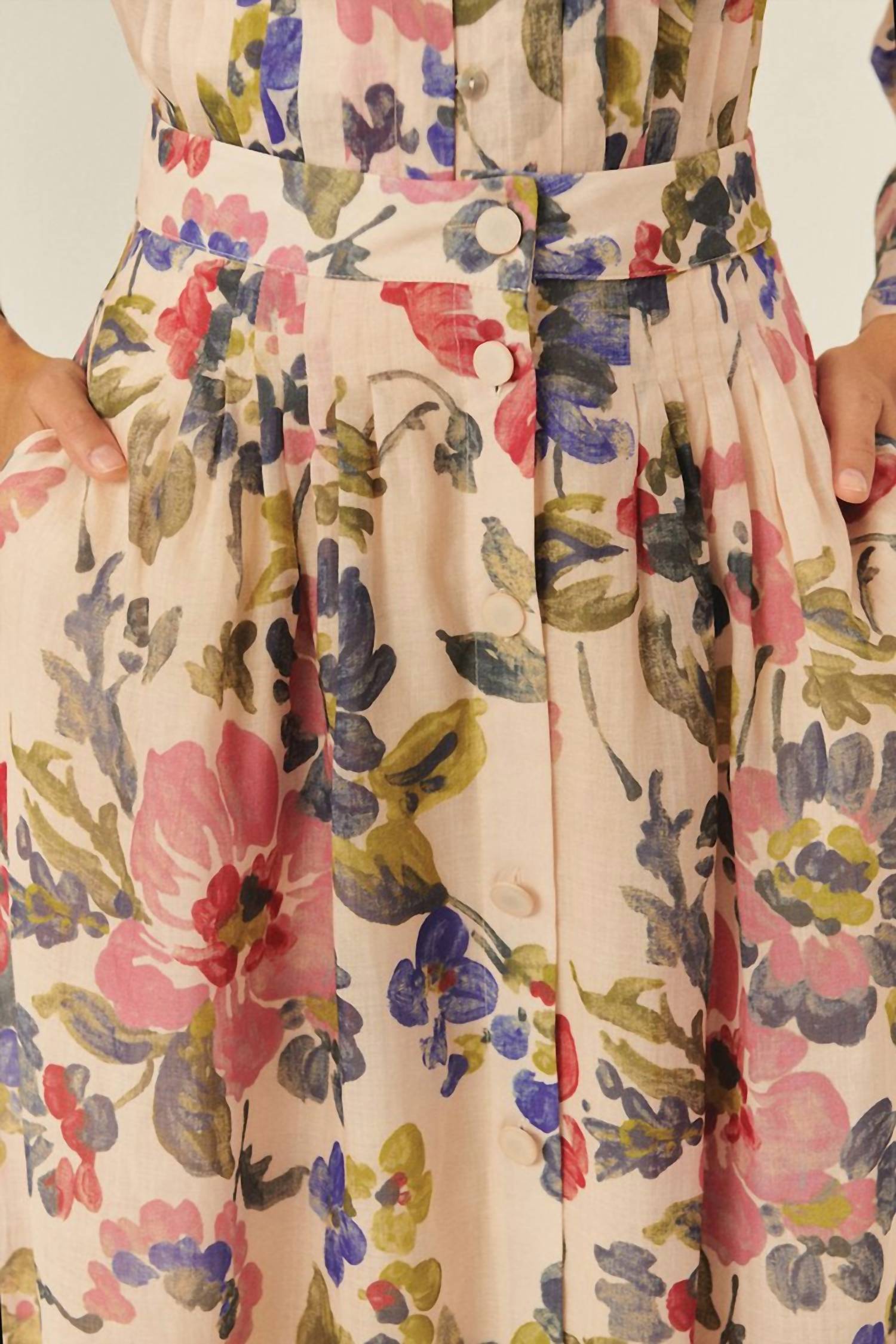 Tuck your favorite tee into this midi length skirt for an effortlessly cool look. Exquise's Maia Skirt is a captivating addition to any wardrobe with its romantic watercolor floral print and boho chic appeal. Crafted from 100% ramie, this midi-length skirt is designed in Turkey and features a concealed zipper for seamless wear and front button detailing for added flair. Perfect for a garden party, this piece boasts a flattering waistband and soft pleats that offer effortless movement. Remember to care for it by dry cleaning only to maintain its elegance.