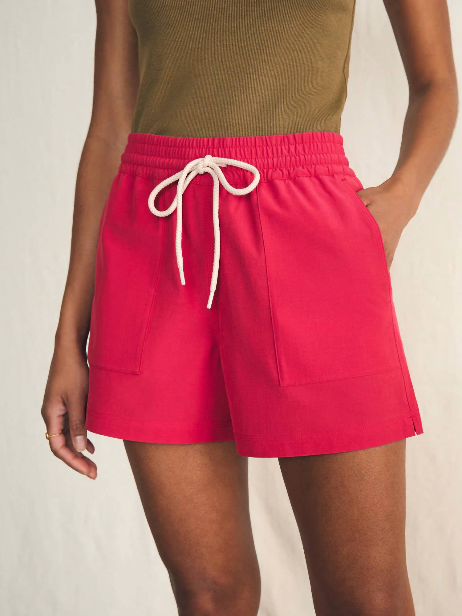 The cutest skort that combines style and functionality. Experience effortless style with the All Day Short by Faherty, crafted for your summer adventures in vibrant Granita. Designed with a slim fit, these shorts sit below the natural waist and feature a 3.5" inseam. Made from 75% recycled polyester, 17% cotton, and 8% elastane, they offer both comfort and sustainability. The elastic waistband adds flexibility, complemented by an adjustable drawcord and practical pockets. Care: Close all fastenings before washing, turn inside out, and machine wash cold with like colors. Model Gabrielle is 5'9" and wears a size small.