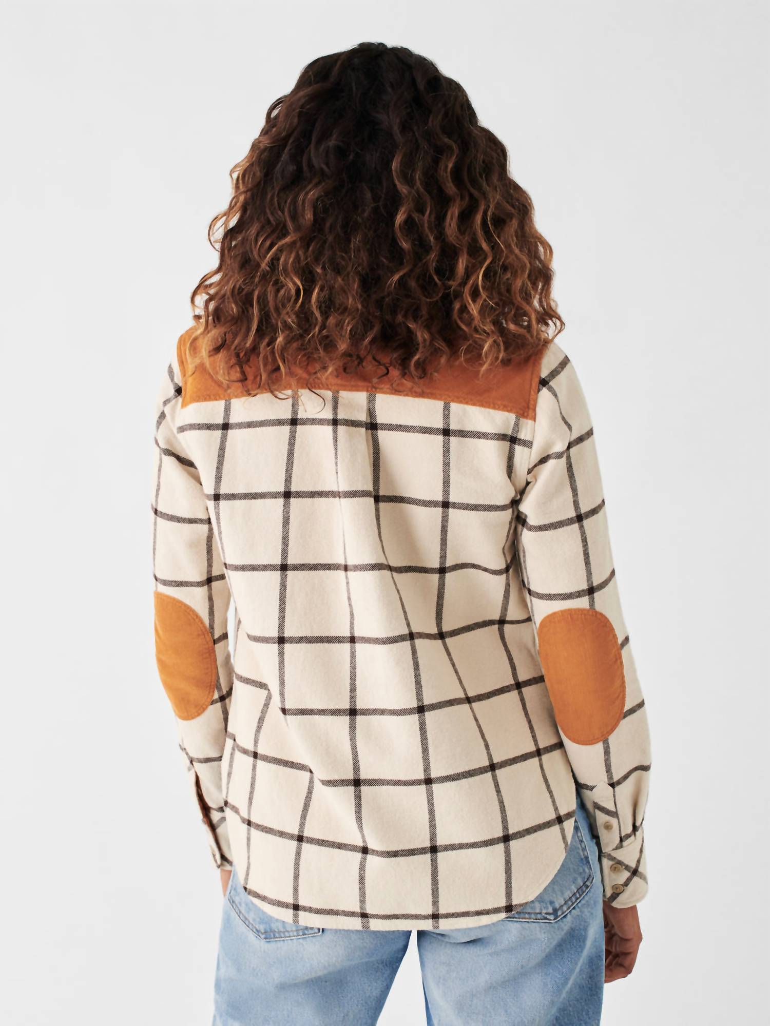 A classic button down shirt that will never go out of style. Crafted in stretch cotton flannel. Featuring corduroy shoulder and elbow patches, an oversized fit and shirttail hem. Relaxed and slightly oversized. Two chest flap pockets. Corduroy shoulder and yolk insets and elbow patches. Material: 100% Cotton. Chanté is 5'10 wearing size Small . Turn inside out. Machine wash cold with like colors. Gentle cycle. Do not bleach. Tumble dry low. Remove promptly. Cool iron when needed. Sku: WOF2209-OLP.