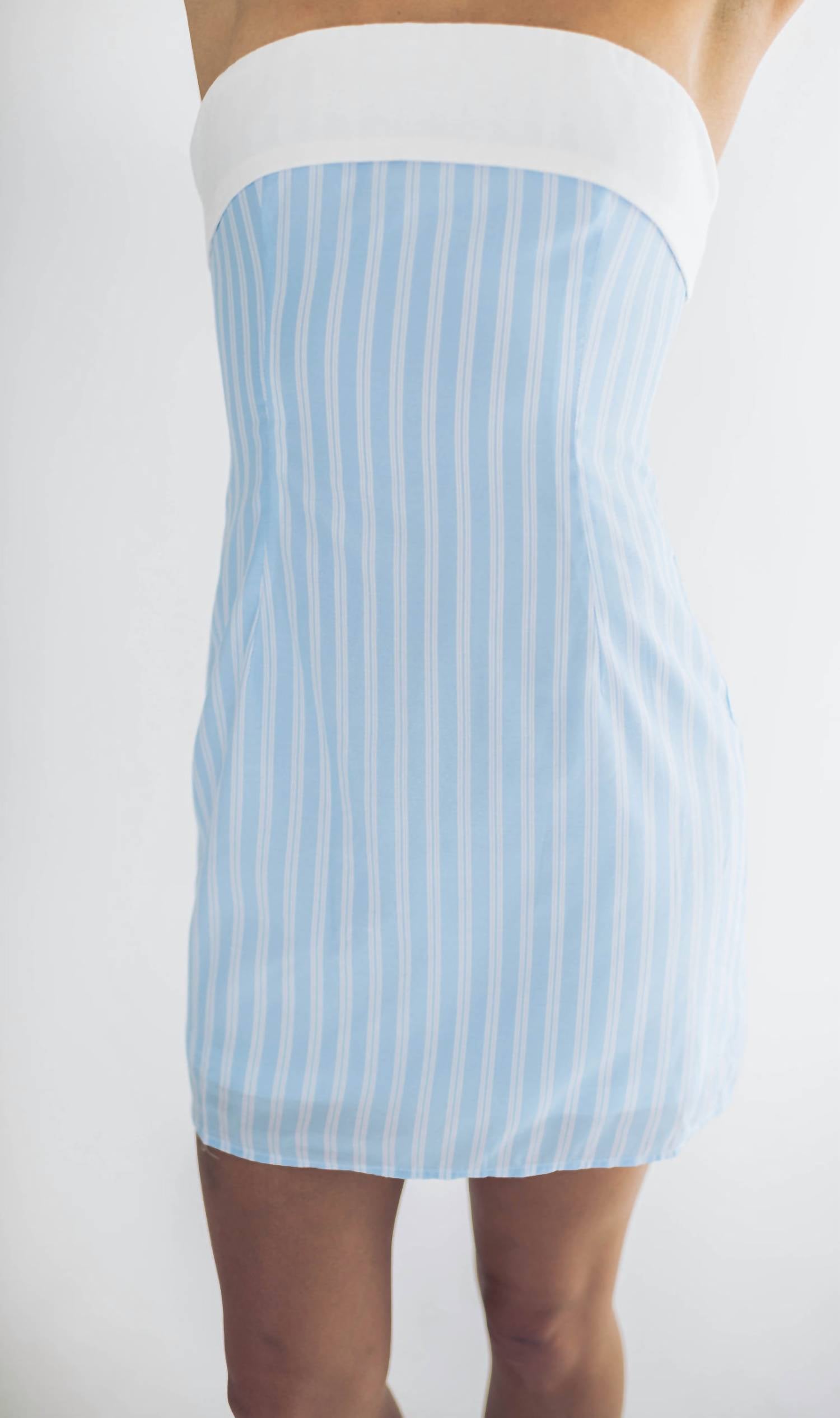 Introducing the Alma Strapless Mini Dress by Falcon Park, a summer staple that effortlessly combines classic and contemporary style. This dress is designed in a sheath silhouette with a strapless, off-the-shoulder neckline, fully lined for added comfort. Crafted from a cotton blend, it features blue and white stripes and a chic white contrast fold-over band. The dress is equipped with a back zip closure for convenience. Model is wearing a size small (5'7" height, 34" bust, 25" waist, 36" hip).