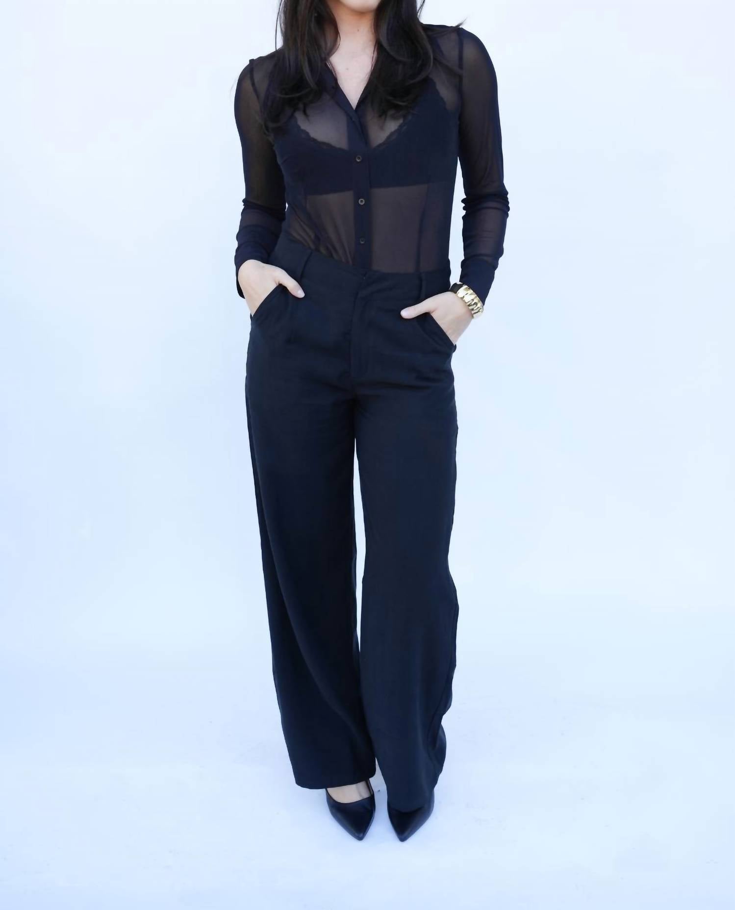 Introducing the Jordyn Sheer Bodysuit by Falcon Park, a chic and versatile piece in classic black designed to elevate any ensemble. This long sleeve bodysuit features a stylish collared neckline with button and snap closures, complemented by button cuffs. Crafted from a 94% Nylon and 6% Spandex blend, this textured piece boasts a sheer finish, making it perfect for layering. Care for this garment with a hand wash and easy tumble dry. The model is wearing a medium (5'8" height, 31" bust, 26" waist, 36.5" hip).