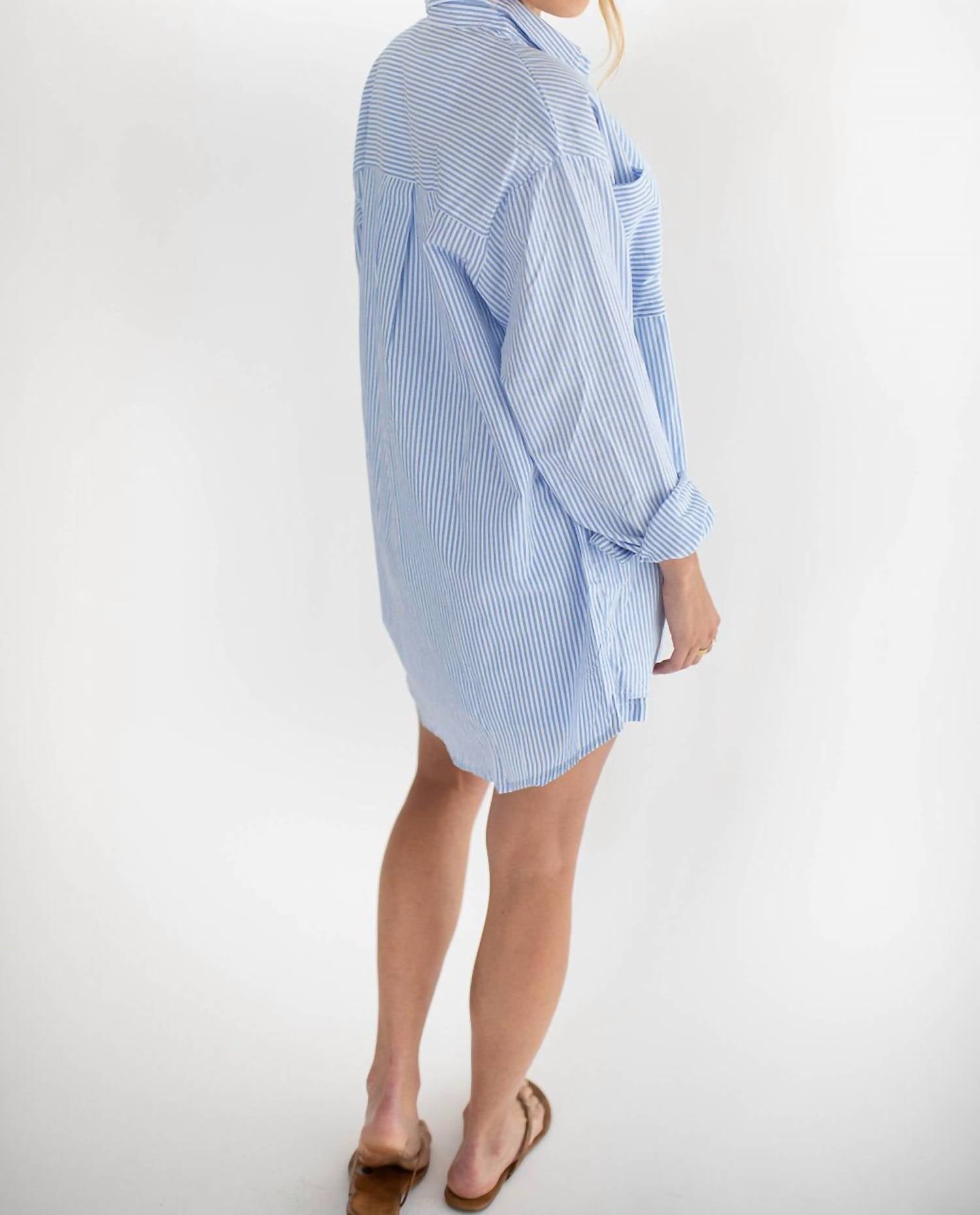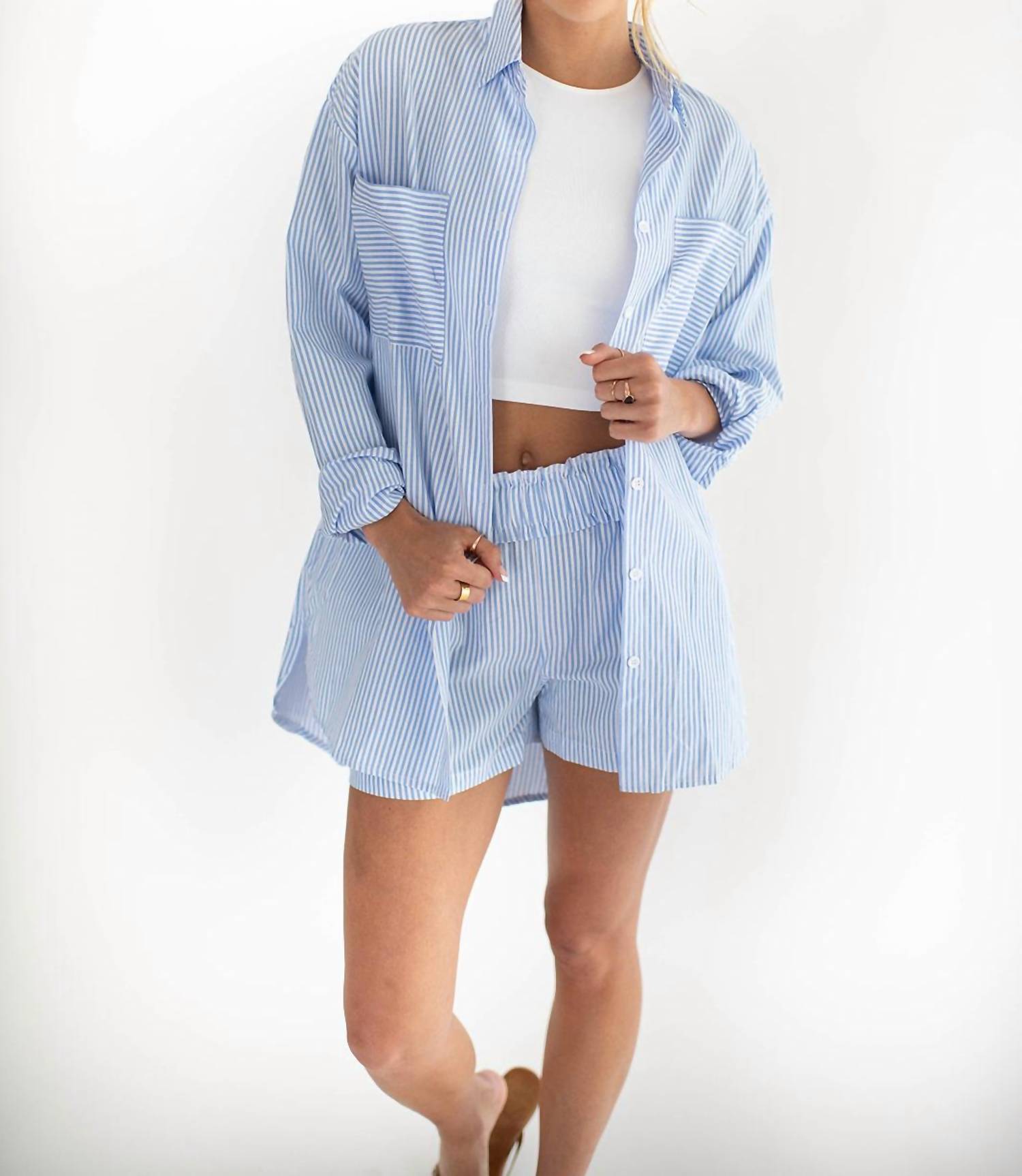 Discover the Kalani Set by Falcon Park, perfect for sun-kissed adventures with its nautical-inspired charm. The set features a slightly oversized, long sleeve top with a crisp collar and a button-down front, paired with comfortable elastic waistband shorts. Composition: 55% cotton, 45% polyester. Care instructions: Machine wash and line dry. Model is wearing a size small (5'7" height, 34" bust, 25" waist, 36" hip).
