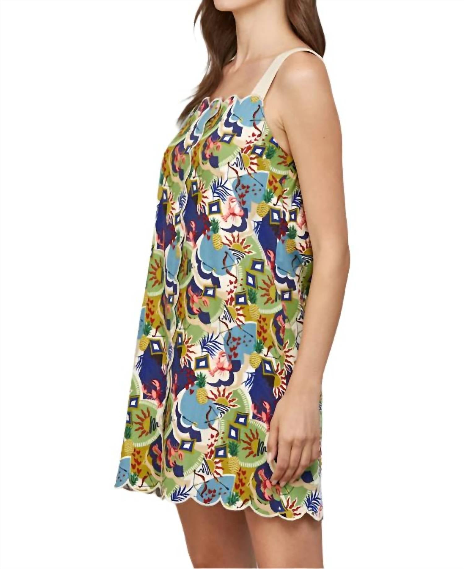 The kind of easy and flattering dress you'll be reaching for all season long. Step into summer with the Linen Blend Scallop Edge Mini Dress by Fate, an ideal choice for warm and sunny days. This shift dress features a sleeveless design and a charming scallop edge detail, patterned with a lively tropical print. Composition: 70% Rayon, 30% Linen. Perfect for occasions such as a baby shower or celebrating Cinco de Mayo, it promises both comfort and style.