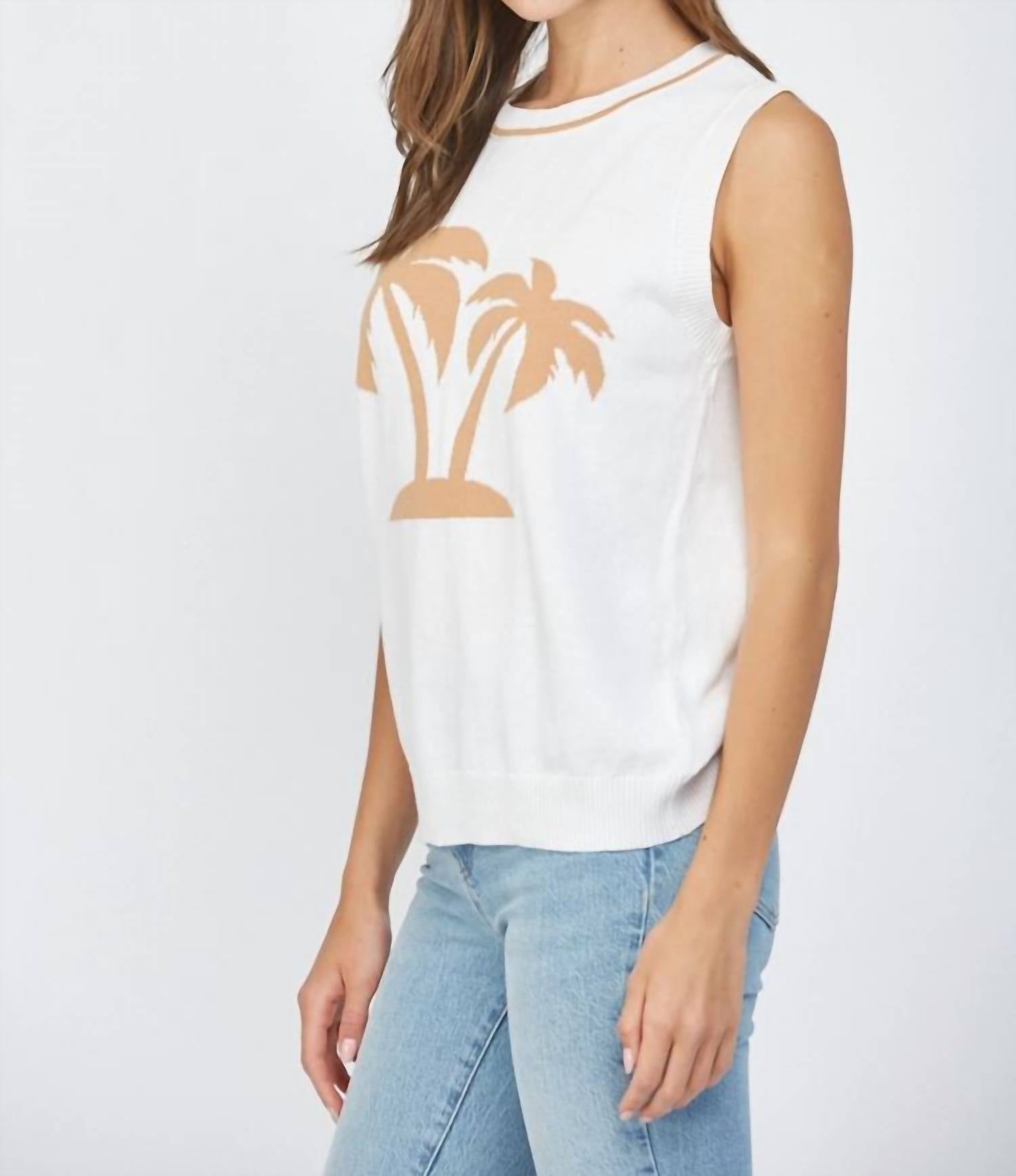 This classic tank top is perfect for layering and cute enough to wear on its own. Elevate your vacation wardrobe with the Palm Tree Knit Sweater Tank by Fate, a minimalist staple in cream and tan. This sleeveless top features a graphic pattern and a comfortable crewneck. Closure: Pull-on. Care: Machine wash and tumble dry.