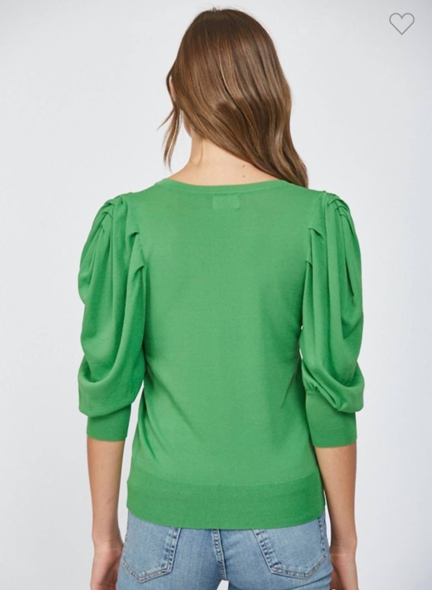 You'll be reaching for this comfy and classic v-neck sweater all season long. Introducing the Puff Sleeve V Neck Sweater by Fate, a lightweight piece perfect for the minimalist's spring wardrobe. Designed with short puff sleeves and a flattering V-neckline, this green sweater offers a solid pattern ideal for travel or St. Patrick's Day. Crafted from 65% Viscose and 35% Nylon, it features a comfortable pull-on closure. Care for this stylish item with machine wash instructions; note that it tends to run small with sizes available in Small (2/4), Medium (4/6), and Large (6/8).