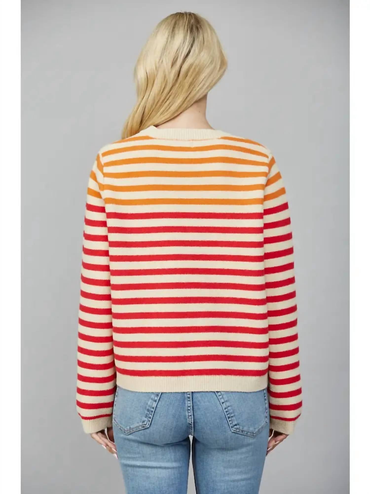 Throw this adorable cardigan over any cami or tank top. Introducing the Sunset Stripes Cardi by Fate, a statement piece in vibrant orange, red, and cream stripes. This long sleeve cardigan is crafted from soft knit material and features a classic crew neckline with a button closure, providing comfort without bulk. Its relaxed fit makes it ideal for layering, hitting at the hip for versatile styling. Perfect for travel and Thanksgiving occasions, it offers a cozy feel for year-round wear.