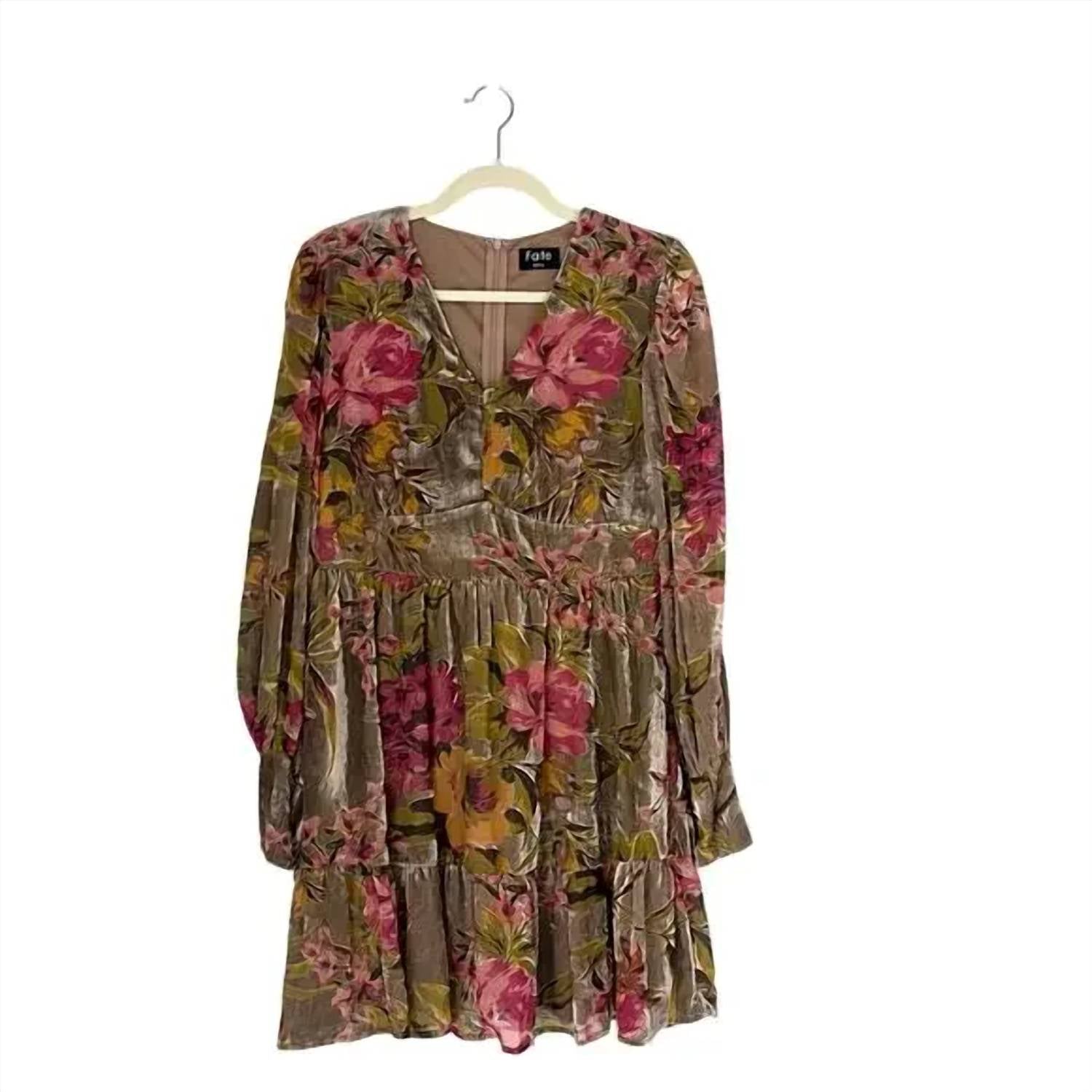 A flattering yet comfortable dress you'll be reaching for season after season. Boho chic piece designed for those who love a mix of elegance and whimsy. Long sleeve dress features a V-neckline with a floral pattern that complements its luxurious velvet composition. Tiered A-line silhouette, combined with puff sleeves and ruched details. Zip closure. Hand wash.