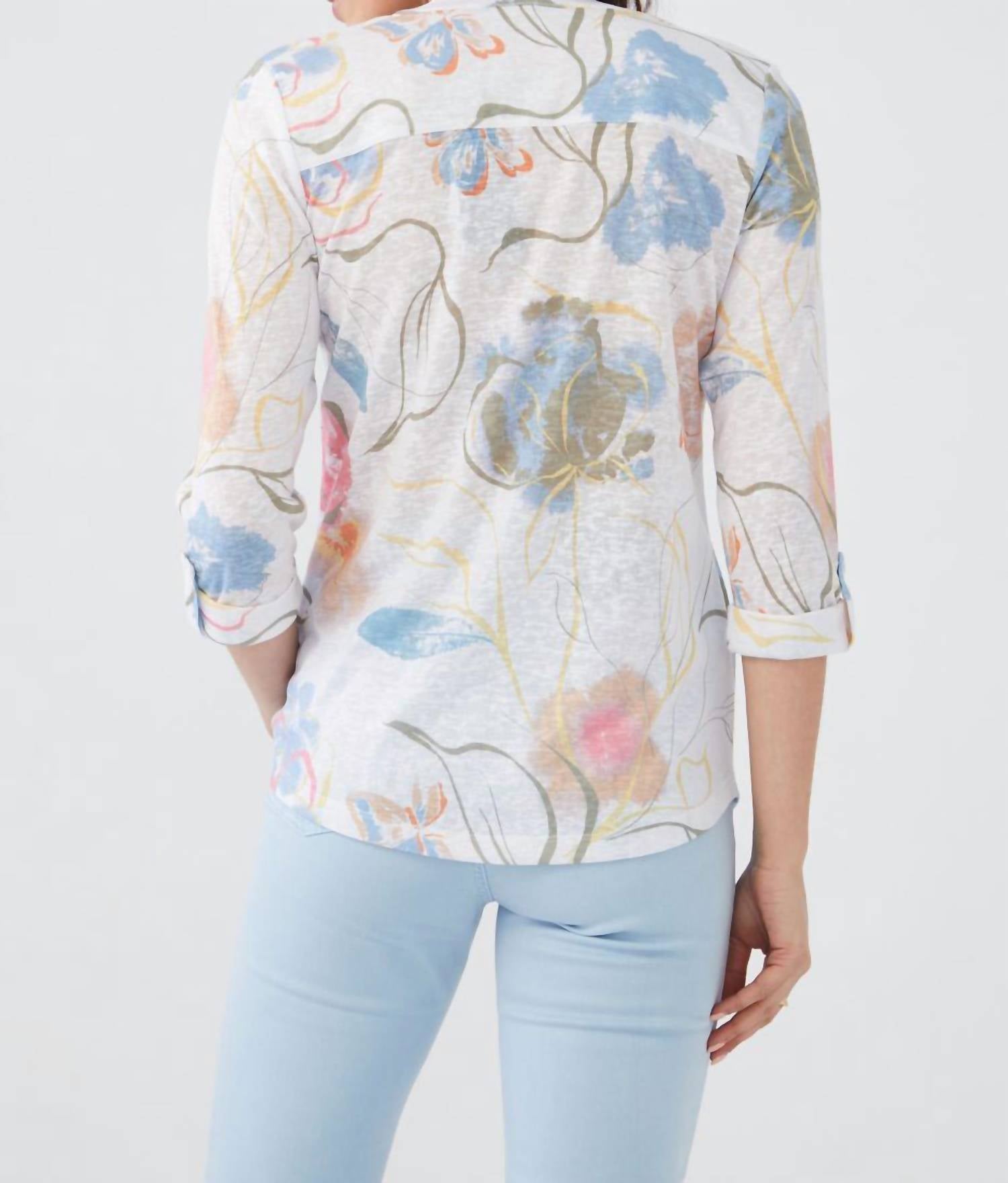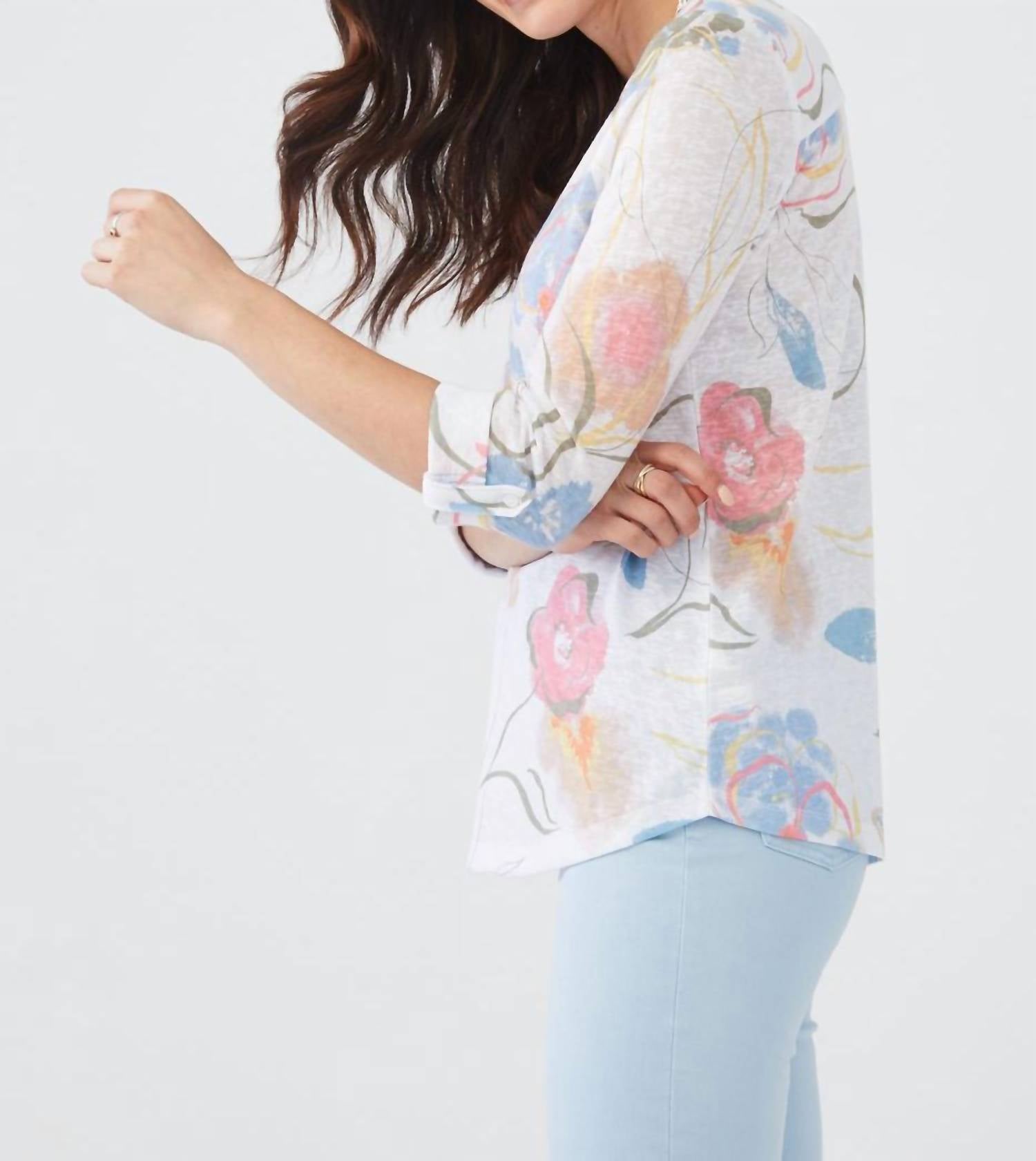 Pair this with your favorite jeans and slides for your next girls night out. Discover the FDJ Floral Tab Up Three Quarter Sleeve Blouse, a charming piece that captures the essence of spring with its vibrant floral pattern. This women's blouse features a flattering three-quarter tab sleeve and a v-neckline for a feminine silhouette. Crafted from 100% polyester, it offers comfort and style perfect for travel occasions. Closure: Button closure.