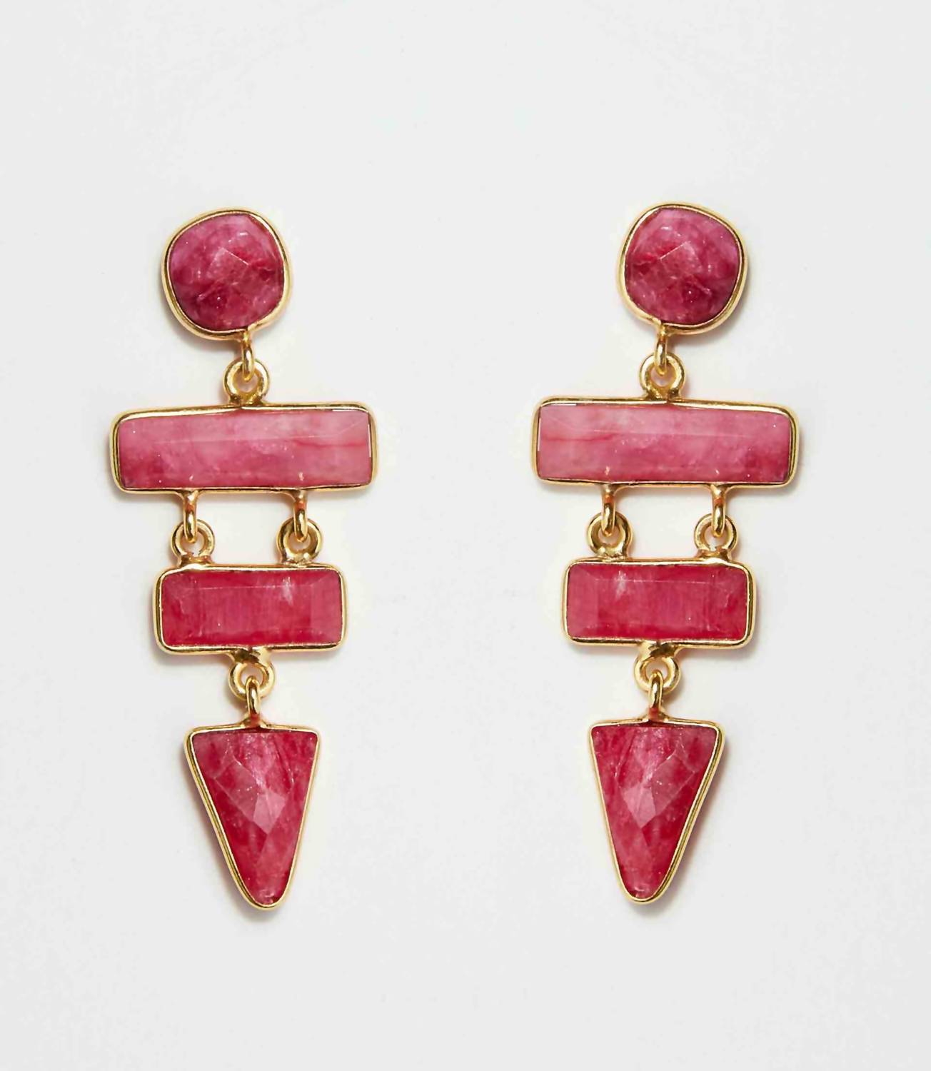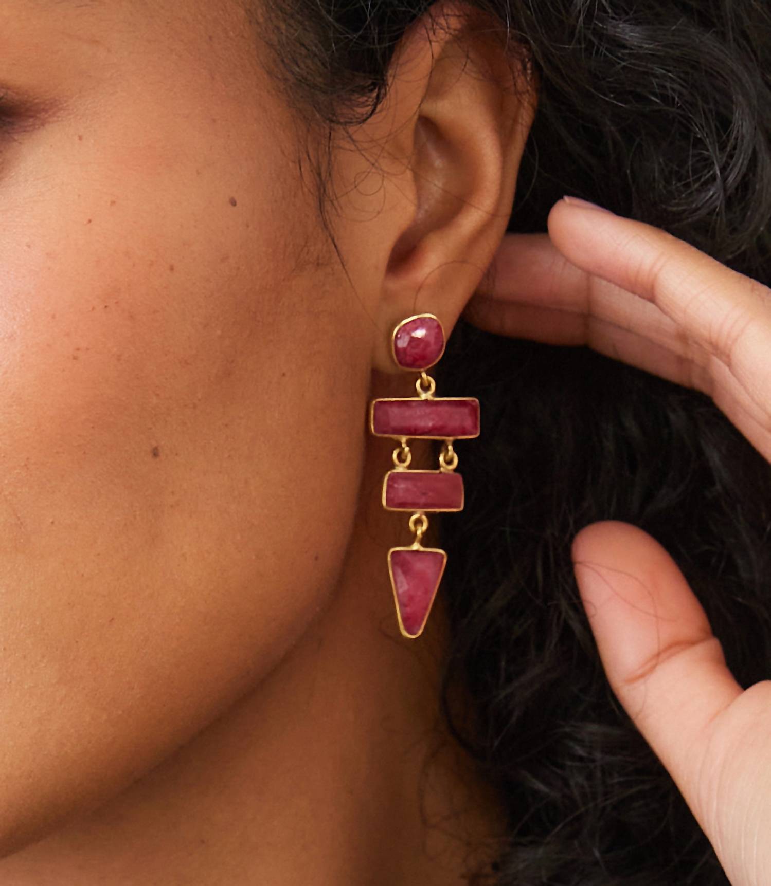 eye-catching earrings for every occasion. Introducing the Felix Z Gemstone Dangle Earrings, a stunning piece to elevate your jewelry collection. Crafted with silver gold plating and embellished with dyed ruby stones, these earrings feature four tiers of geometric shapes, including circles and triangles, that add a bold sophistication to any outfit. With a charming 2.75" height, they weigh just 0.33 oz., making them a comfortable yet eye-catching addition to your ensemble. These imported earrings offer an elegant touch of ruby red glamour to your look.