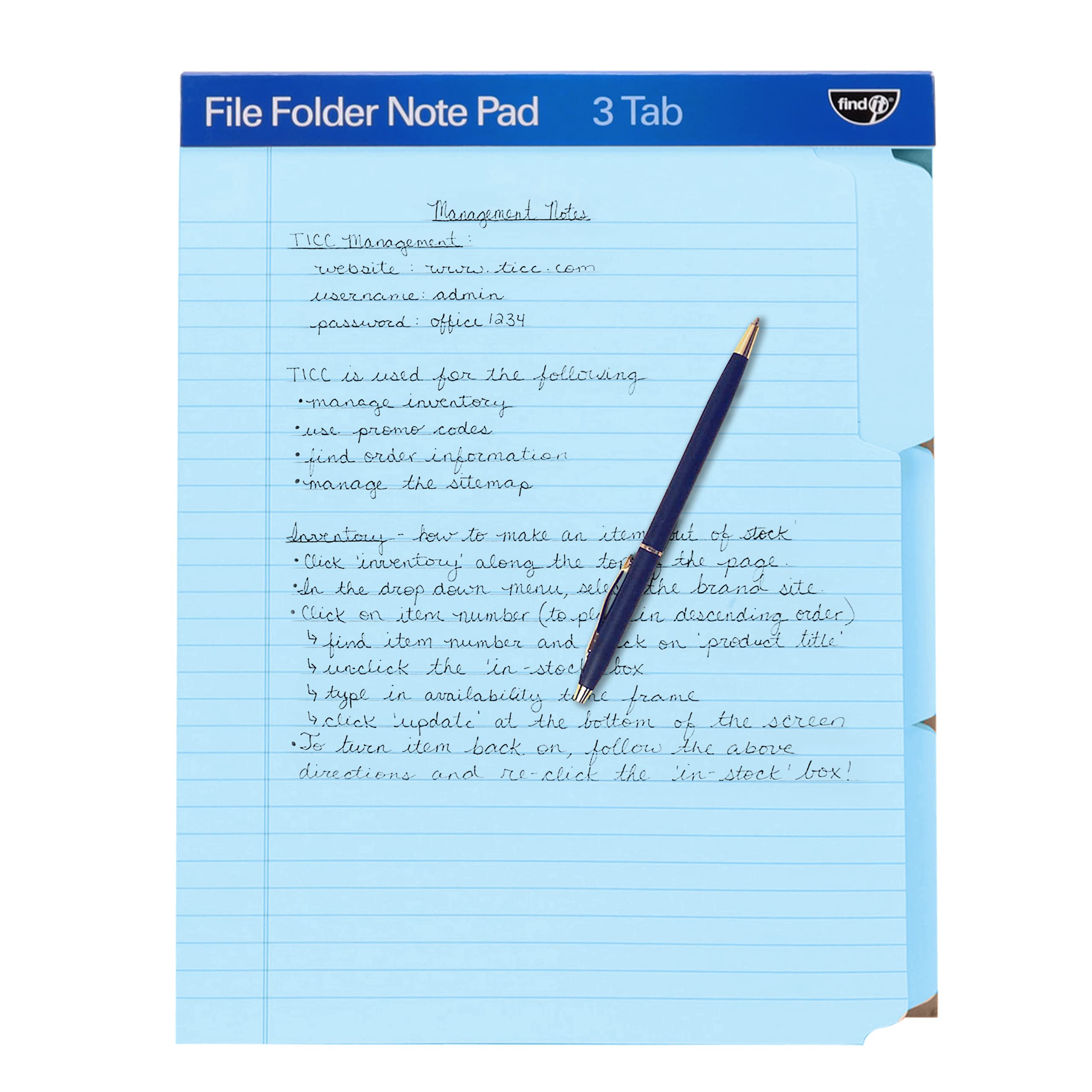 - WIDE RULED - The patented design of these notepad manila folders has changed the paper filing game forever. The wide-ruled pocket offers a place to keep your notes and documents in one place.