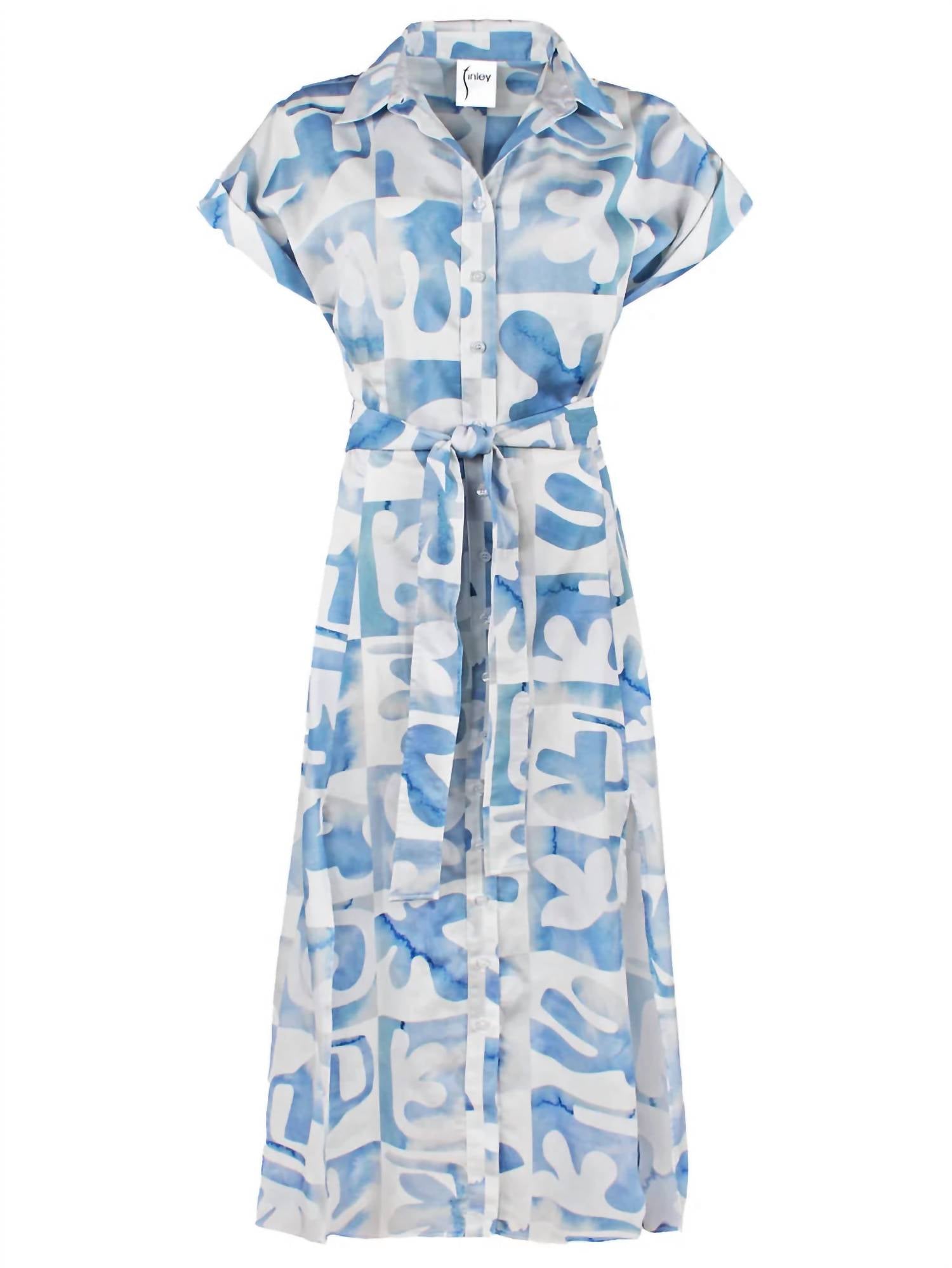 Just add slides or mules and you are good to go. Experience effortless style with the Finley "Chantel" Short Sleeve Maxi Dress, featuring a captivating white and blue abstract motif. This ankle-length shift dress showcases short cap sleeves and is crafted from 100% cotton, offering a breath of fresh air with its non-stretch fabric design. A spread collar pairs with a button closure and self-tie belt, allowing for a personalized fit. For care, machine wash cold and lay flat to dry.