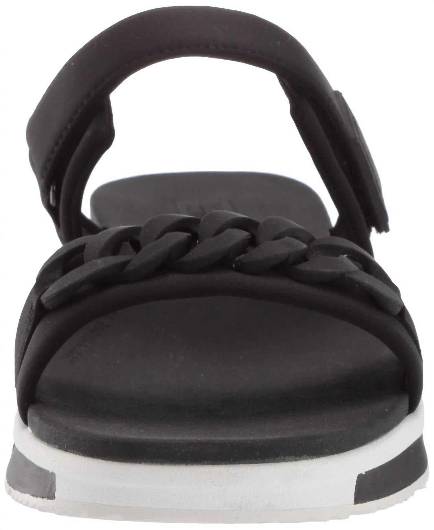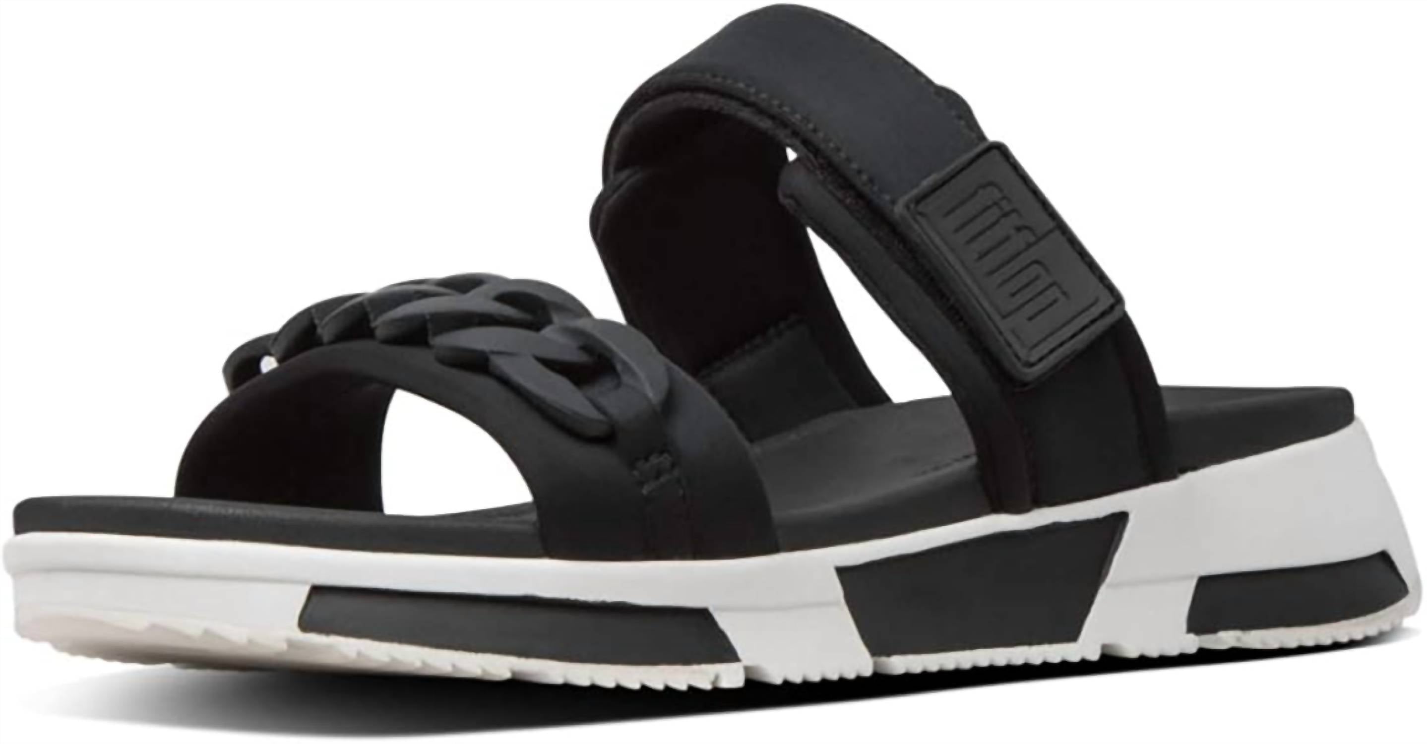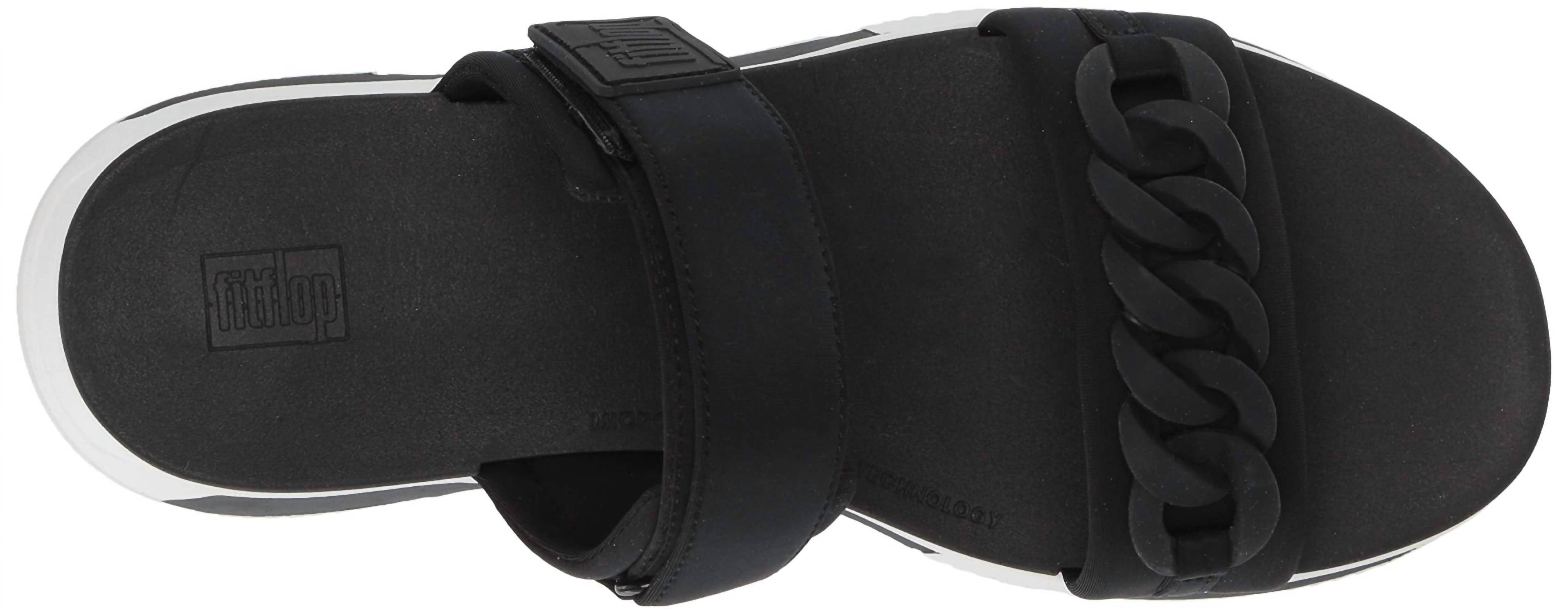 Stylish, comfy, and versatile. We can't find anything wrong with these. Experience unparalleled comfort with the FitFlop Women's Heda Sport Slide-chain Sandal Slip On Mule, featuring a chic open toe and stylish rubber chain detailing. Made with a slip-resistant cleated rubber outsole and an adjustable quick-stick strap, these sandals are not only fashionable but also functional. The pressure-diffusing midsole with three levels of targeted cushioning offers biomechanical support for all-day comfort. Featuring a heel height of approximately 1.5 inches, these sandals are perfect for those seeking both style and support. The average to wide fit ensures a perfect match for diverse foot sizes, ensuring optimal comfort for every foot.