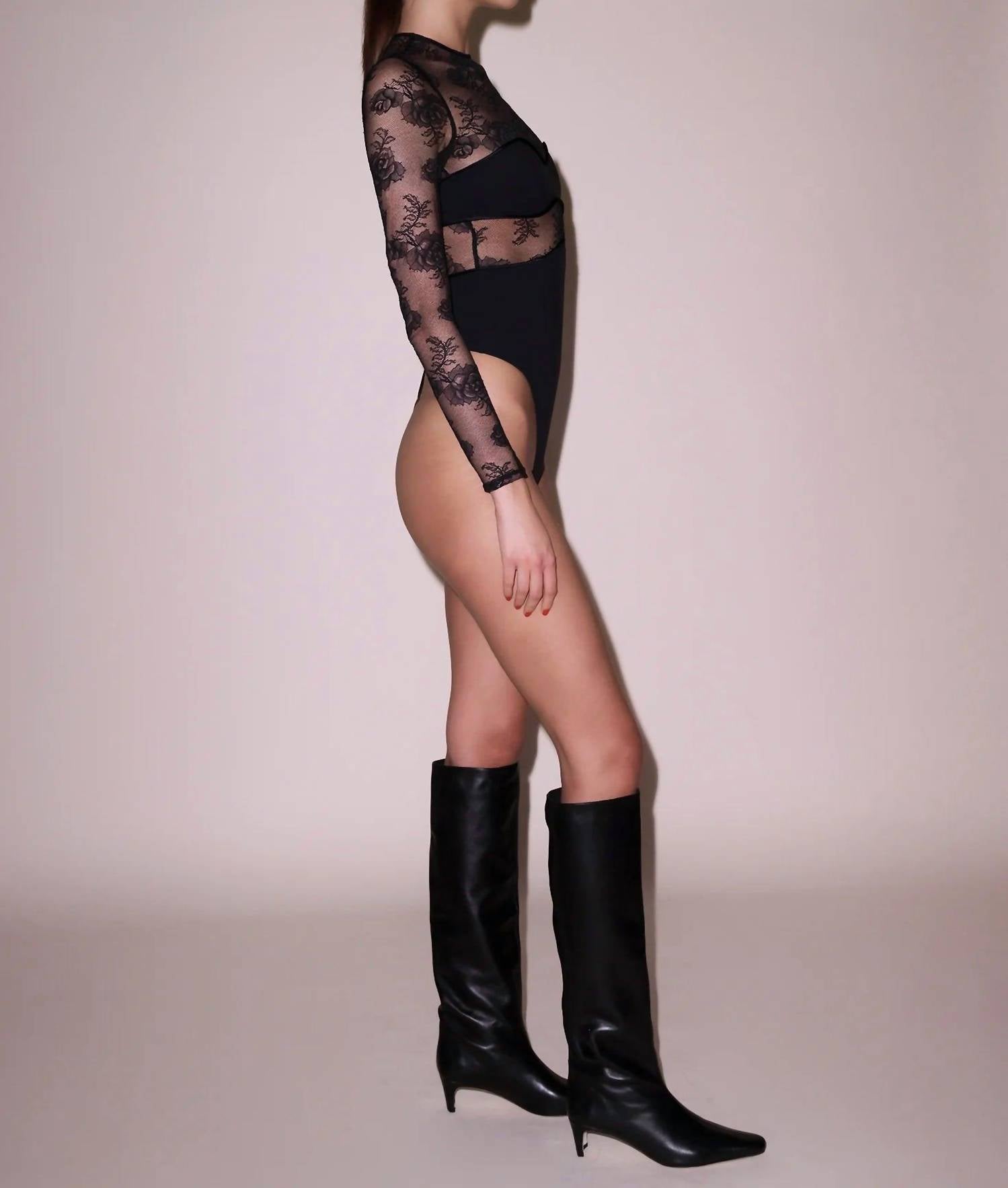 The Bouquet Lace & Jersey Long Sleeve Bodysuit by Fleur Du Mal is a distinguished choice in black, perfect for occasions like anniversaries or Valentine's Day. With luxurious Italian jersey, textured stretch floral leavers lace, and designed with a crewneck, this bodysuit embodies the season's quiet luxury trend. Composition combines 78% Polyamide and 22% Elastane in the lace, with seams of 90% Polyamide and 10% Elastane, featuring a back zipper and a bottom snap closure. Care for this piece with hand washing and laying flat to dry, while the model, 5'10," is seen in a size small, noting the style runs slightly small.