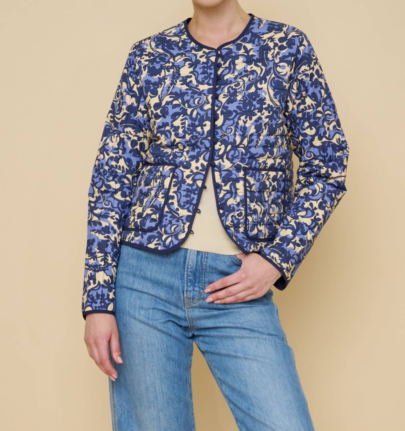 Cozy, cute and timeless. The puffer jacket that will keep you warm all season long. Elevate your winter wardrobe with the Terra Jacket by Flora Bea, featuring a charming floral print on a quilted cotton fabric in the Grapevine Gardens color. This long sleeve puffer comes with covered button closure and practical front pockets for added convenience. It is crafted from 100% cotton, with a lining made from 92% polyester and 8% spandex, ensuring both comfort and warmth. Made in China, this boho chic jacket is machine washable, making it perfect for stylish and easy travel.