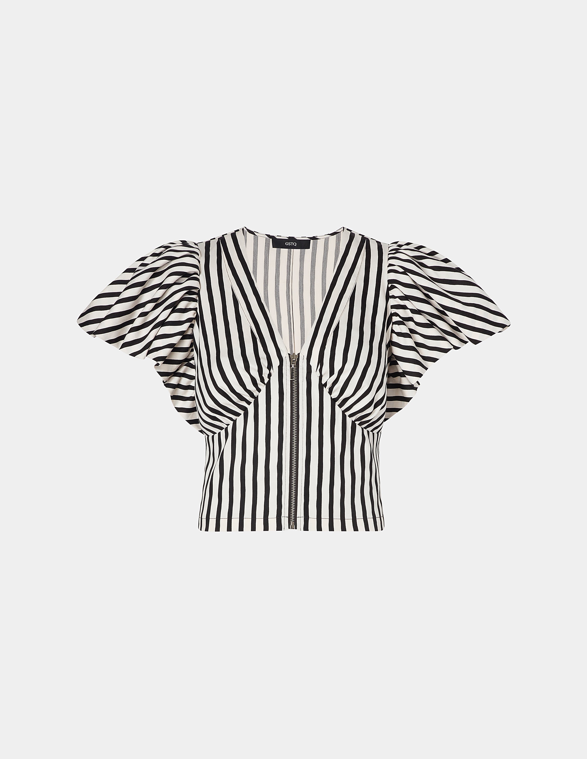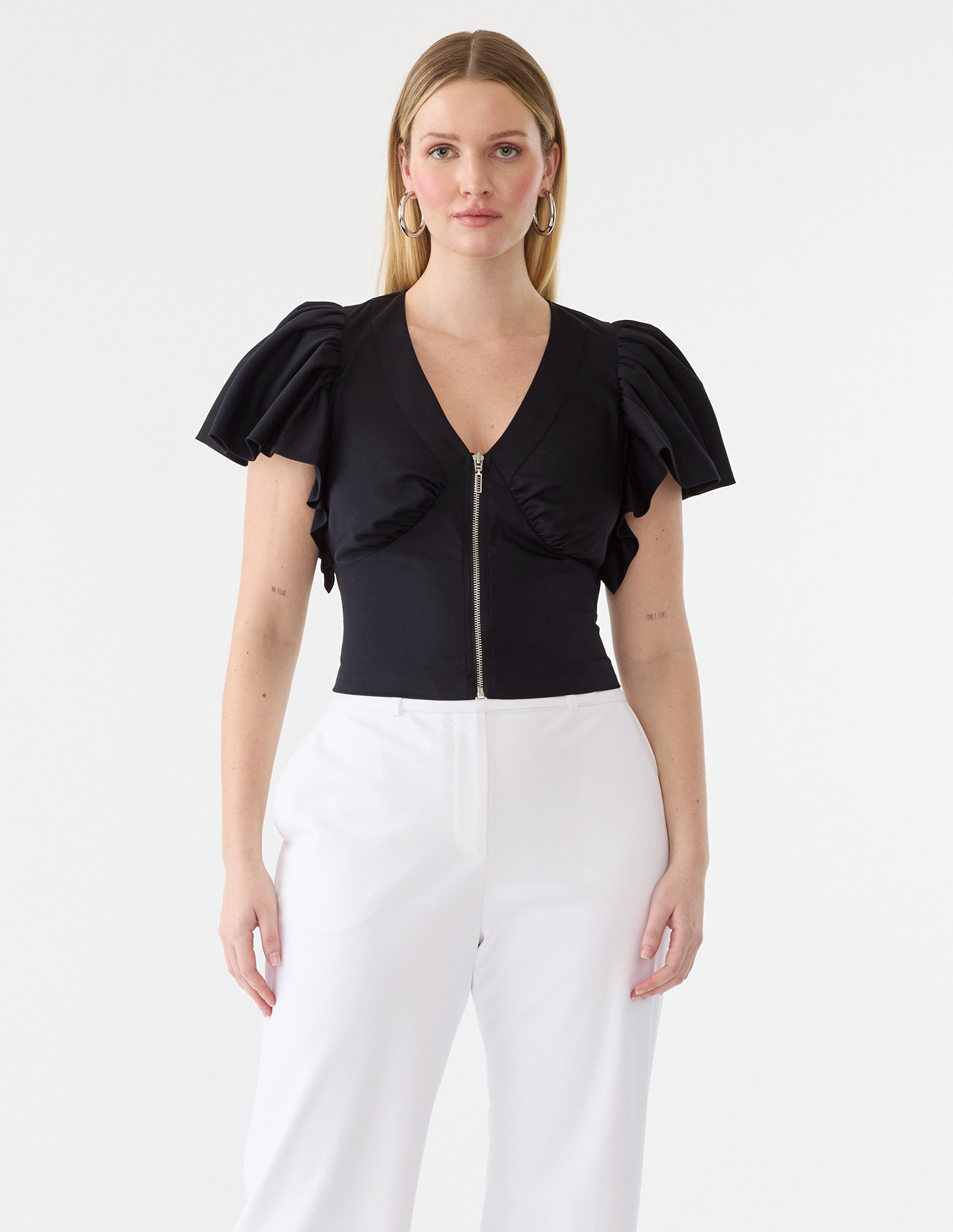 Designed with dramatic flutter sleeves and a corset-inspired silhouette, this top commands attention as a statement piece.