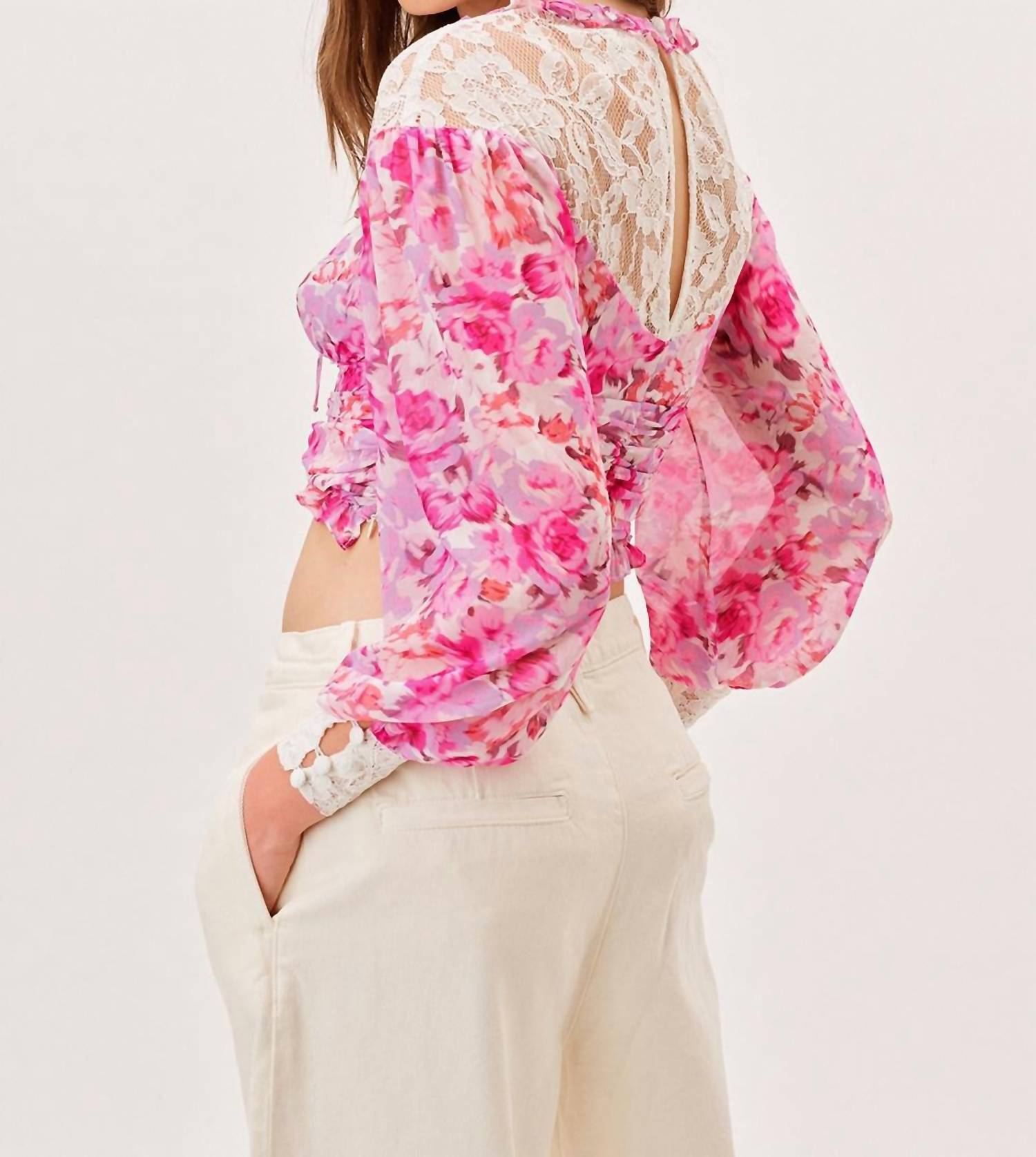 The perfect crop top for those warmer weather days. Enhance your spring wardrobe with the LARA CROP TOP by For Love & Lemons in a charming pink floral pattern. Featuring long sleeves and made from a nylon blend, this crop top offers intricate details like a ruffled v-neckline and full lace cuffs with functional button closures. The exquisite scallop lace inset at the shoulders and keyhole lace at the back add a boho-chic flair to any vacation look. Composition: Self 100% recycled polyester, Contrast 58% nylon, 42% viscose, Lining 98% recycled polyester, 2% spandex. Care: Dry clean only.