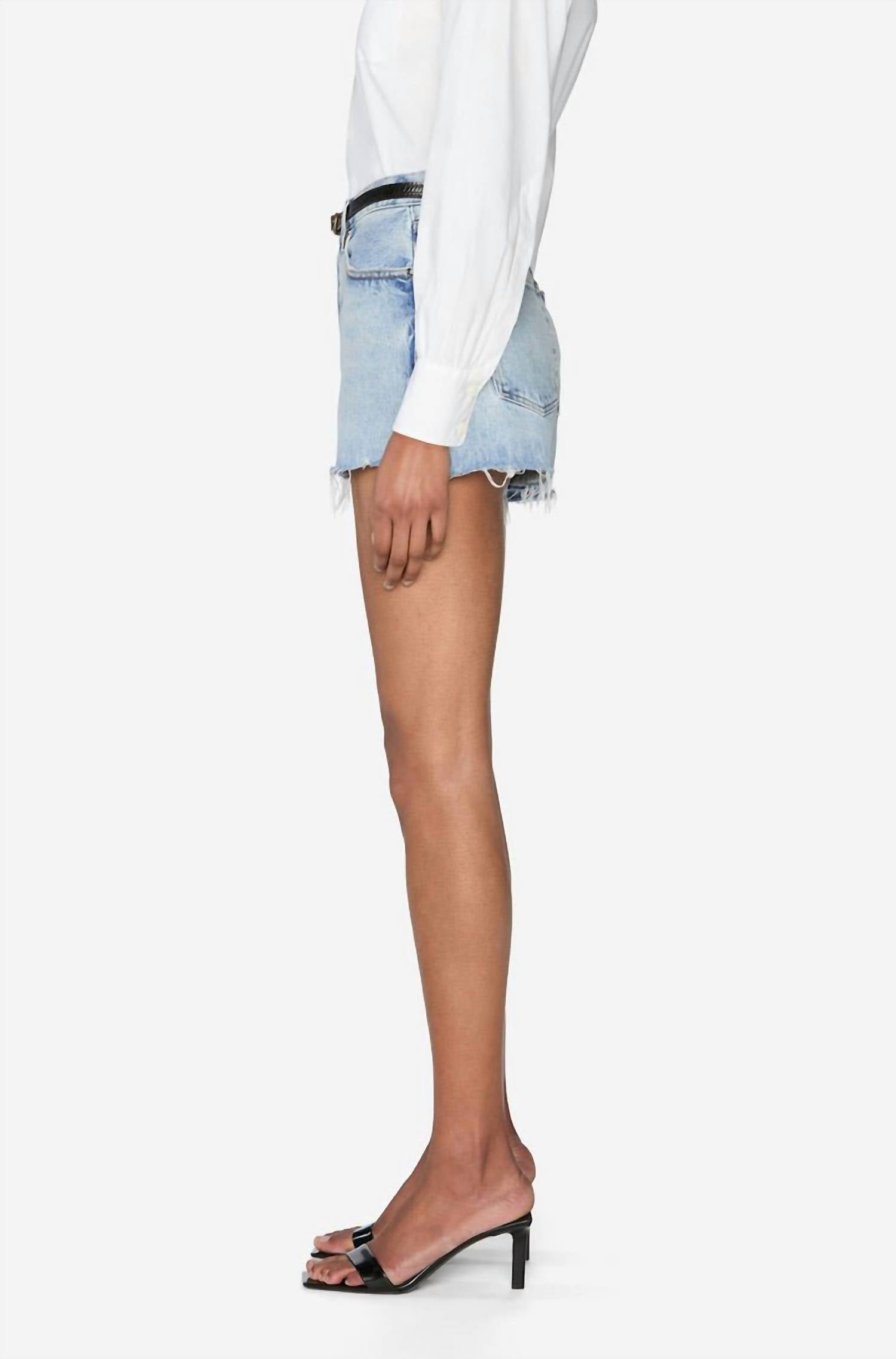 Presenting the Dare Cotton Short by FRAME, an audacious addition to your summer wardrobe. These jean shorts are crafted from 100% cotton, offering a mid-rise fit in a solid blue light wash. They feature raw fray hems and a zip closure, capturing a vintage essence perfect for streetwear and travel occasions alike. Care for these daring shorts is a breeze with machine wash and tumble dry instructions.