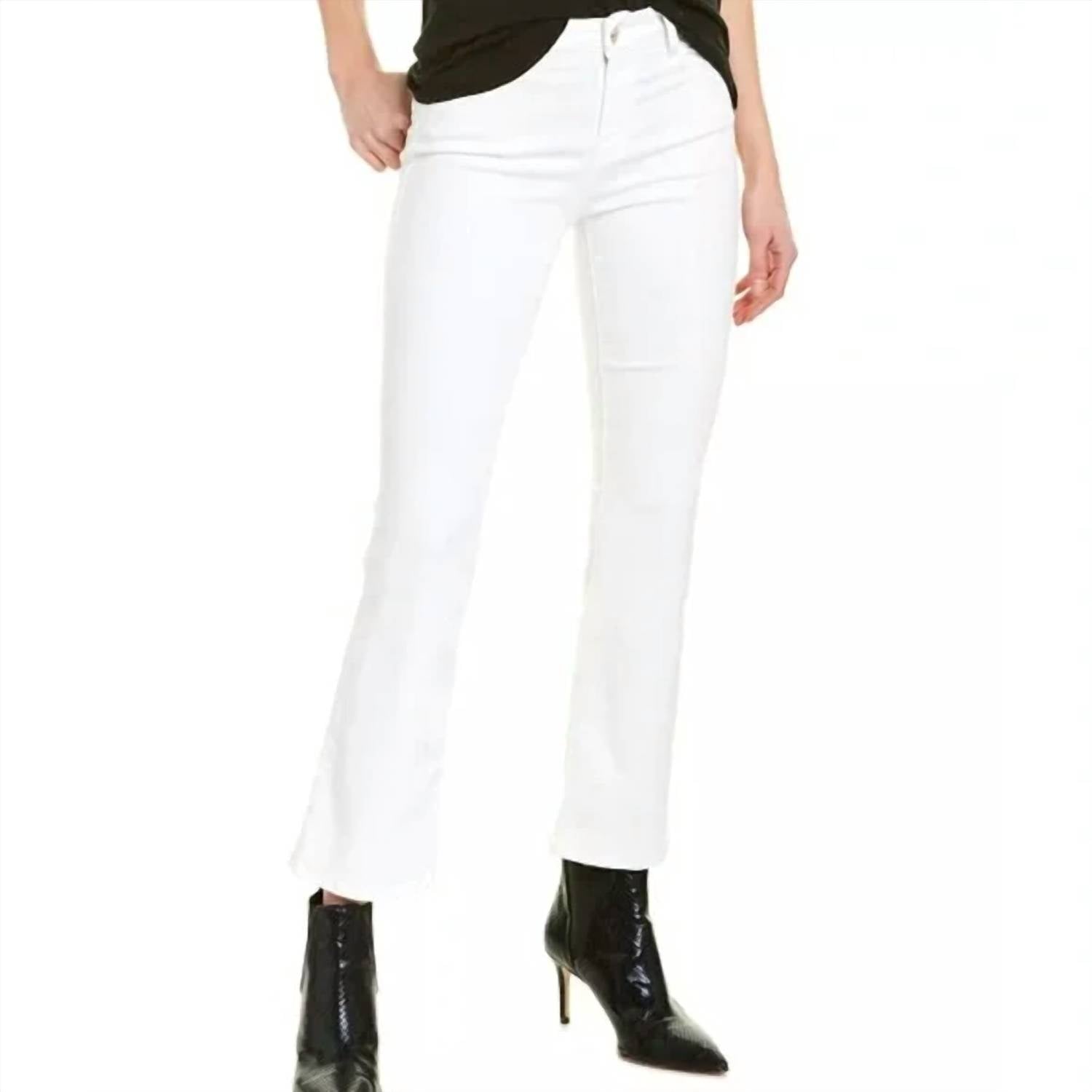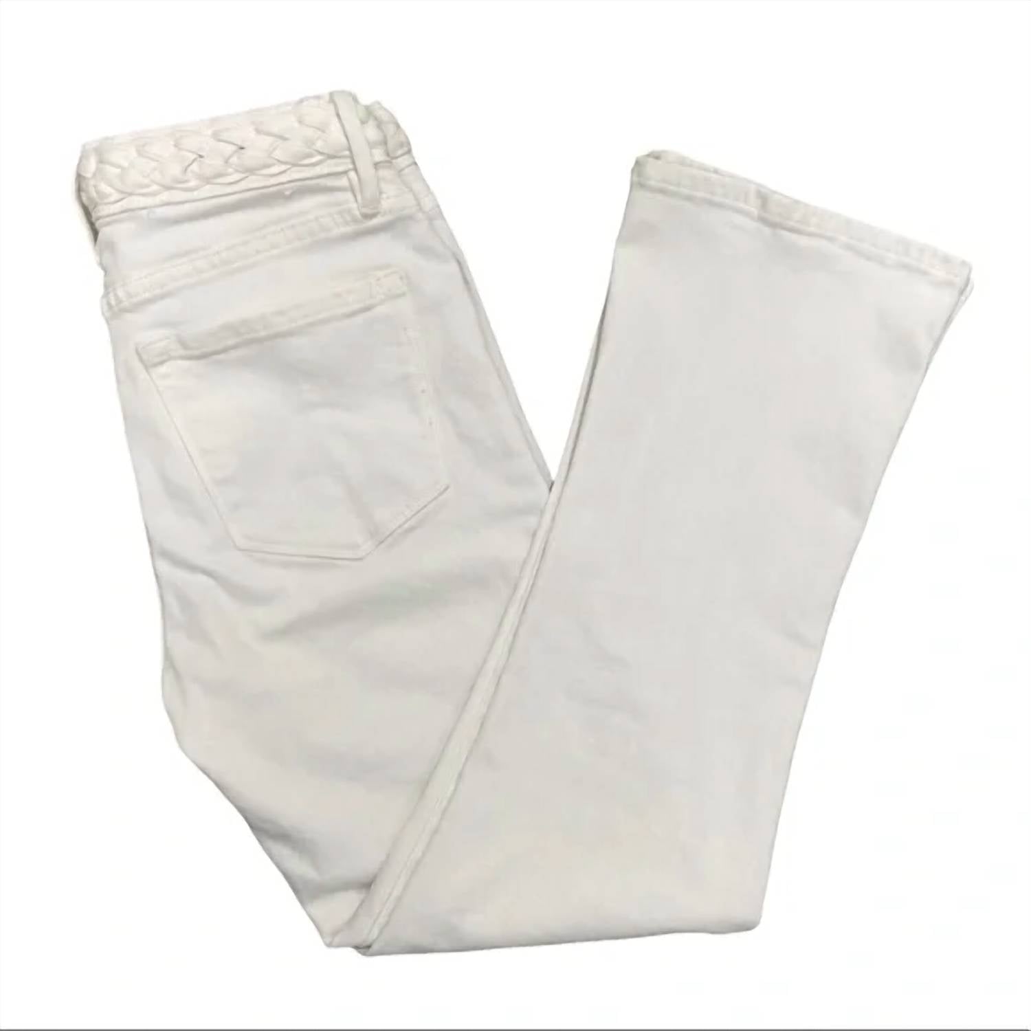 Browse the Denim Braid Waistband Le Crop Mini Boot by FRAME, a stunning addition to your fall wardrobe. This relaxed-fit design features a solid white cotton blend construction with a touch of elastane for comfort. Made in China, it showcases a fashionable flared leg and functional pockets, secured with a button closure. For lasting quality, machine wash and line dry as part of your minimalist style routine.