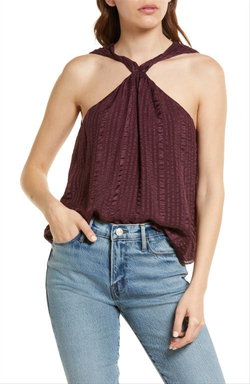 Luxurious silk fabric with textured stripes | Halter neck design for a flattering look | Draped V-back for an elegant finish