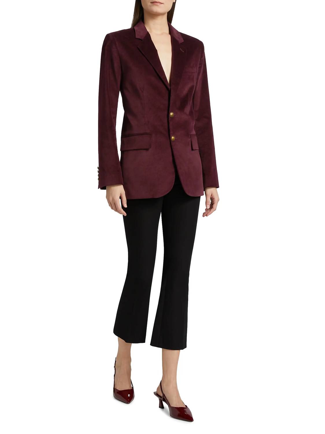 An elevated version of your favorite classic blazer. Designed for the modern woman who values elegance. Crafted with a composition of 97% cotton and 3% elastane. Classic tailored blazer features a luxurious stretch cotton velvet material in a rich burgundy hue. Italian-made piece boasts a two-button single-breasted closure, notch lapels, and practical pockets, including a chest welt and side flap details. For optimal care, dry clean only.