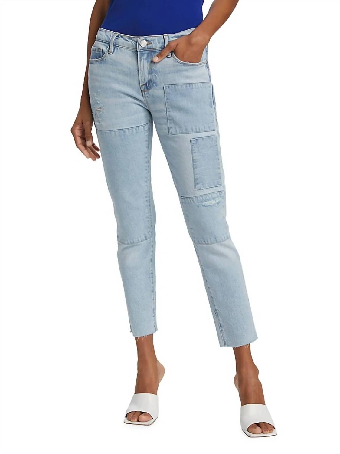 Pair these straight leg jeans with flats, sandals or even heels! You can't go wrong.These cropped jeans are designed in a mid-rise cut and feature unique patchwork detailing for a stylish twist. The classic five-pocket style is complemented by a zip fly and button closure for a secure fit. Made from a blend of 77% cotton, 22% lyocell, and 1% elastane, they offer comfort and flexibility. The rise measures approximately 9.25 inches, the inseam is about 27 inches, and the leg opening is about 12 inches. For care, machine wash cold to keep them looking fresh.