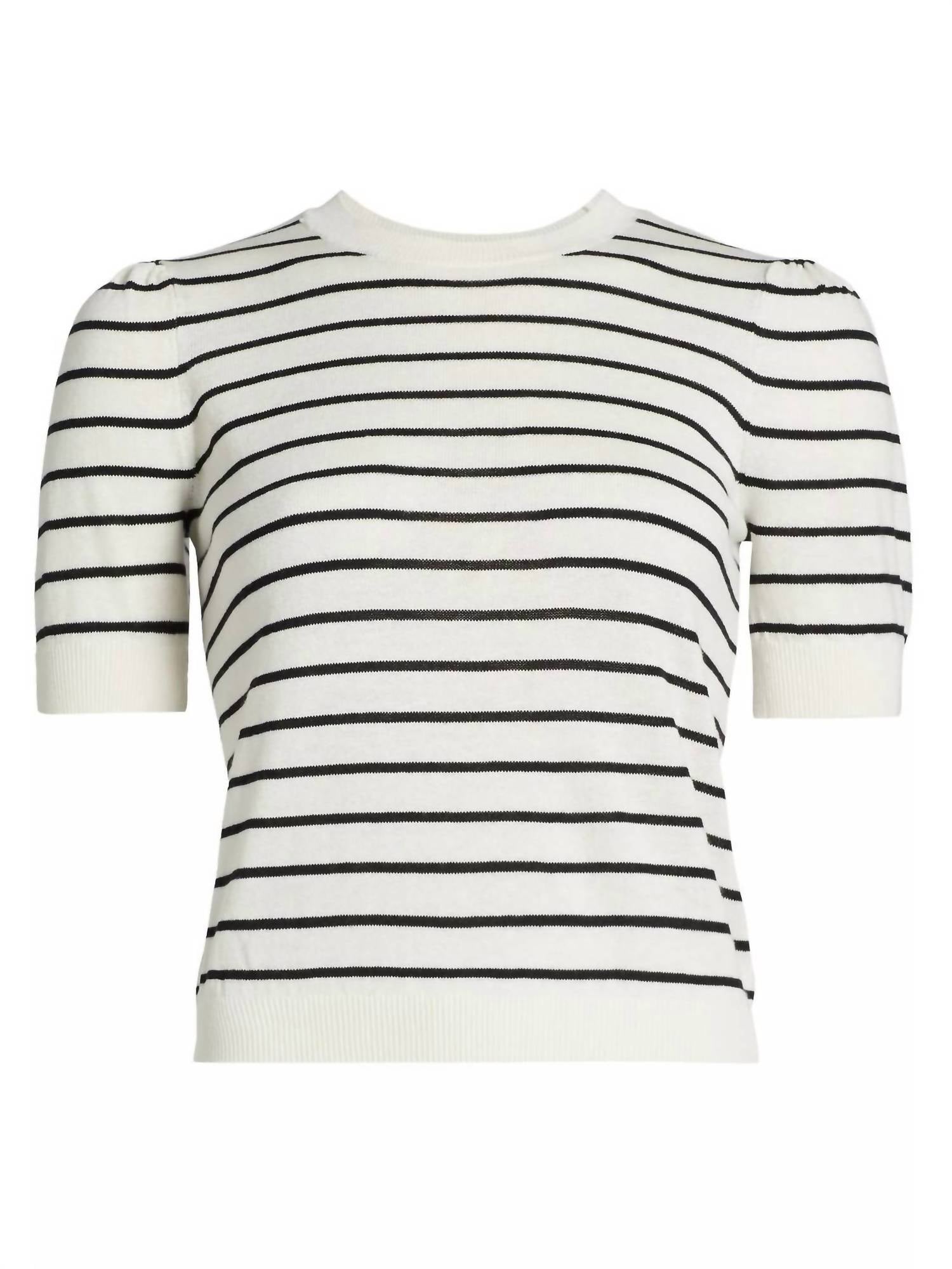 The ultimate go-to sweater, expertly crafted to provide the perfect combination of warmth and style. Its classic design and soft fabric make it a must-have addition to your wardrobe. This piece features short puff sleeves and a classic crew neckline, offering a modern twist on a retro style. Crafted from a lightweight knit composed of 35% cotton, 35% lyocell, and 30% linen, the sweater is designed for comfort and elegance. Dry clean only. Crafted in China, this piece is perfect for a music festival celebration or a stylish New Year's Eve gathering. Garment length: 19.75 inches.