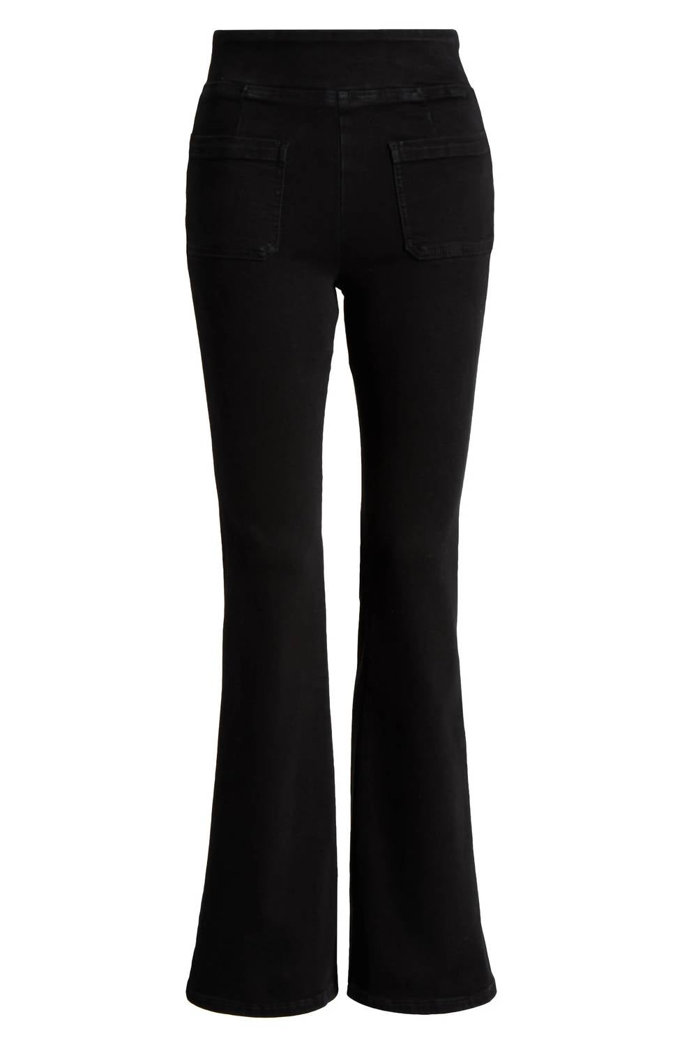 Just as cute as they are comfortable. Elevate your look with the Jet Set Flare Pull On Jeans by FRAME, crafted in Sheen Noir for a dramatic silhouette. These flared-leg jeans are made from a cotton blend of 92% cotton, 4% polyester, and 4% elastane, designed for comfort with an elastic waist and a pull-on style. Featuring both front and back patch pockets, they include a 31" inseam, a 10.5" front rise, and a 20" leg opening, all meticulously made in Turkey. Care for your jeans with ease: machine wash and lay flat to dry.