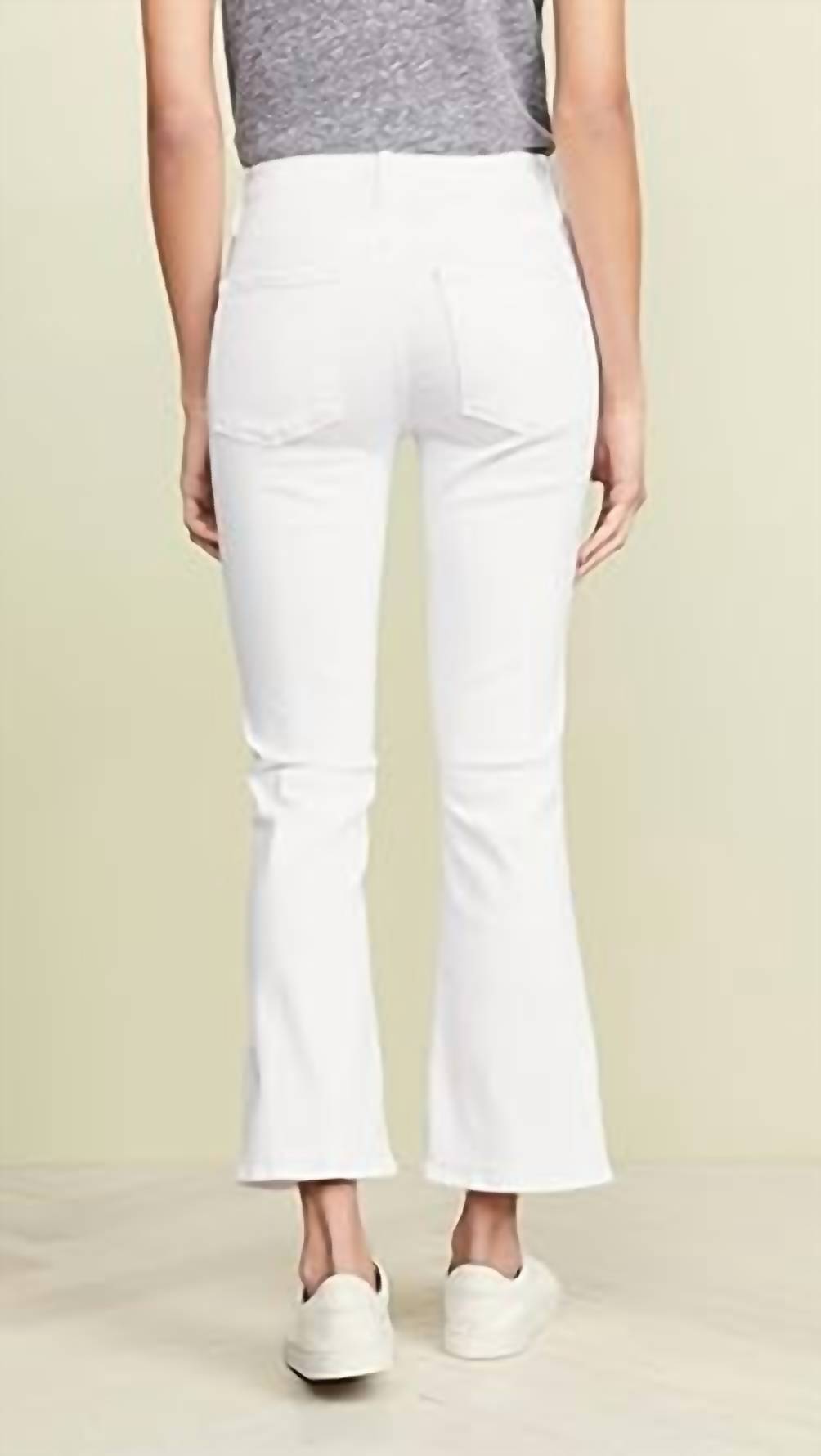 If you're looking for boot-cut, this is the jean for you. Experience the quintessential style with FRAME's Le Crop Mini Boot Cut Jeans in a crisp Blanc shade, perfect for any minimalist wardrobe. Crafted from a cotton blend with 92% cotton, 6% polyester, and 2% elastane, this design offers mid-weight, super-stretch denim comfort. Offering a high-rise fit with an inseam of 26 inches, these jeans feature 5-pocket styling and a classic button closure. Care is simple with machine wash cold instructions, making them a versatile and functional choice for any summer occasion.