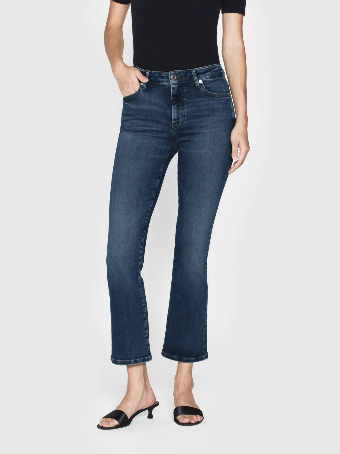 Discover the FRAME Le Crop Mini Boot Jean in Skywalk, a stylish blend of form and functionality with its high rise and flattering cropped length. Crafted from a supple cotton blend, these jeans offer a slight bootcut kick at the knee and a modern tie-dye pattern. Closure: Button closure. Care: Machine wash. The inseam measures 18 inches, making it perfect to showcase your favorite shoes.