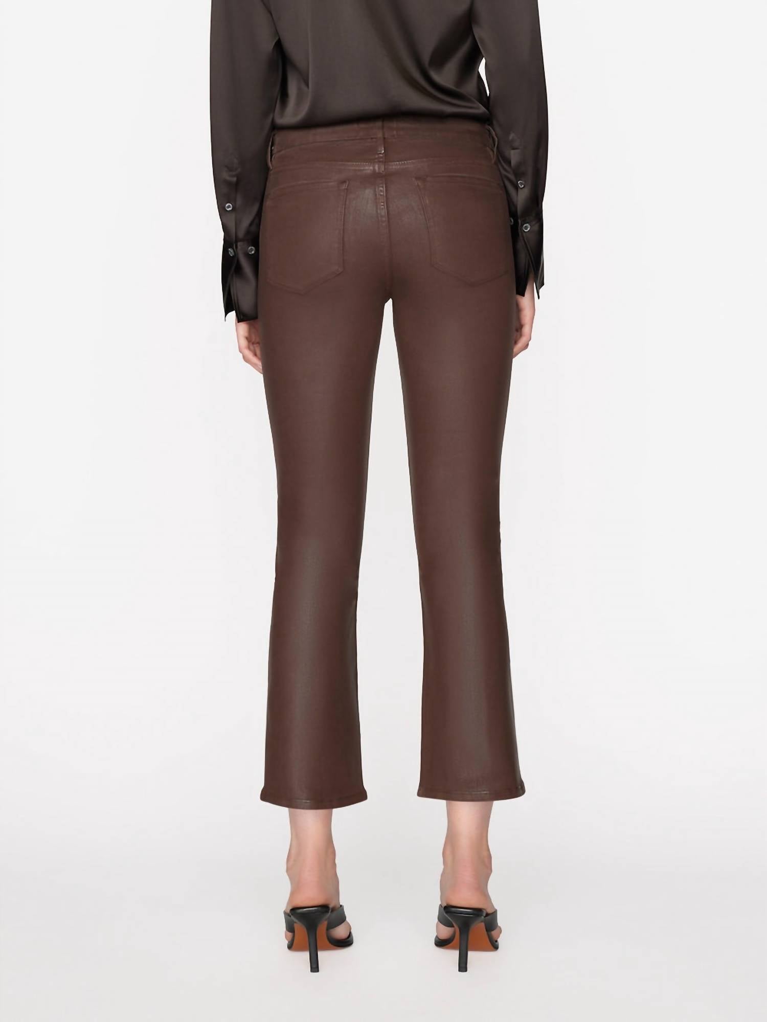 Stay on trend with these stylish boot cut pants that are fit to perfection. The perfect combination of comfort and fashion, you'll be grabbing for these all season long! Mid rise cropped boot cut jeans. Signature coated denim in a dark brown hue. Ultra stretch denim with superior recovery. Measurements - Rise: 9.75". Inseam: 26.5". Leg opening: 17.5". Made from 91.5% Cotton, 6% Polyester and 2.5% Elastane. Dry clean only.