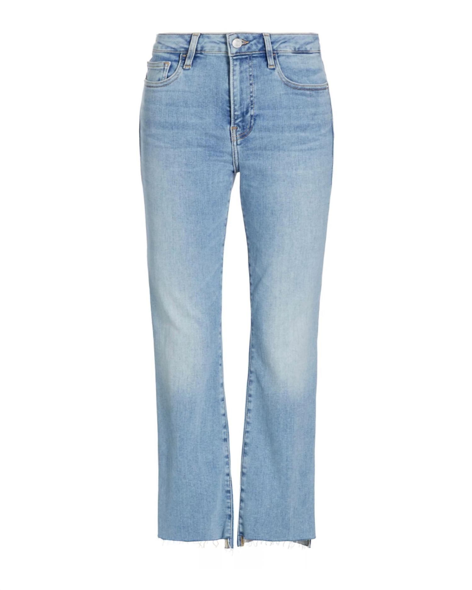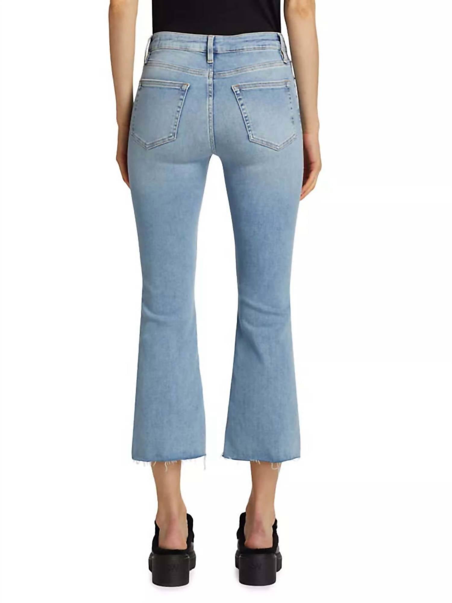 The FRAME Le Crop Mini Boot Step Fray Jeans in the color Colorado are a perfect blend of style and comfort for your travel wardrobe. These high-rise jeans feature a baby boot-cut silhouette with a frayed hem, crafted from a cotton blend composed of 90% cotton, 5% polyester, and 5% elastane. With a rise of about 10.5 inches and an inseam of about 26.5 inches, they include a button closure and a five-pocket design. These jeans are imported and can be maintained with machine washing for easy care, making them a minimalist staple for any season's collection.