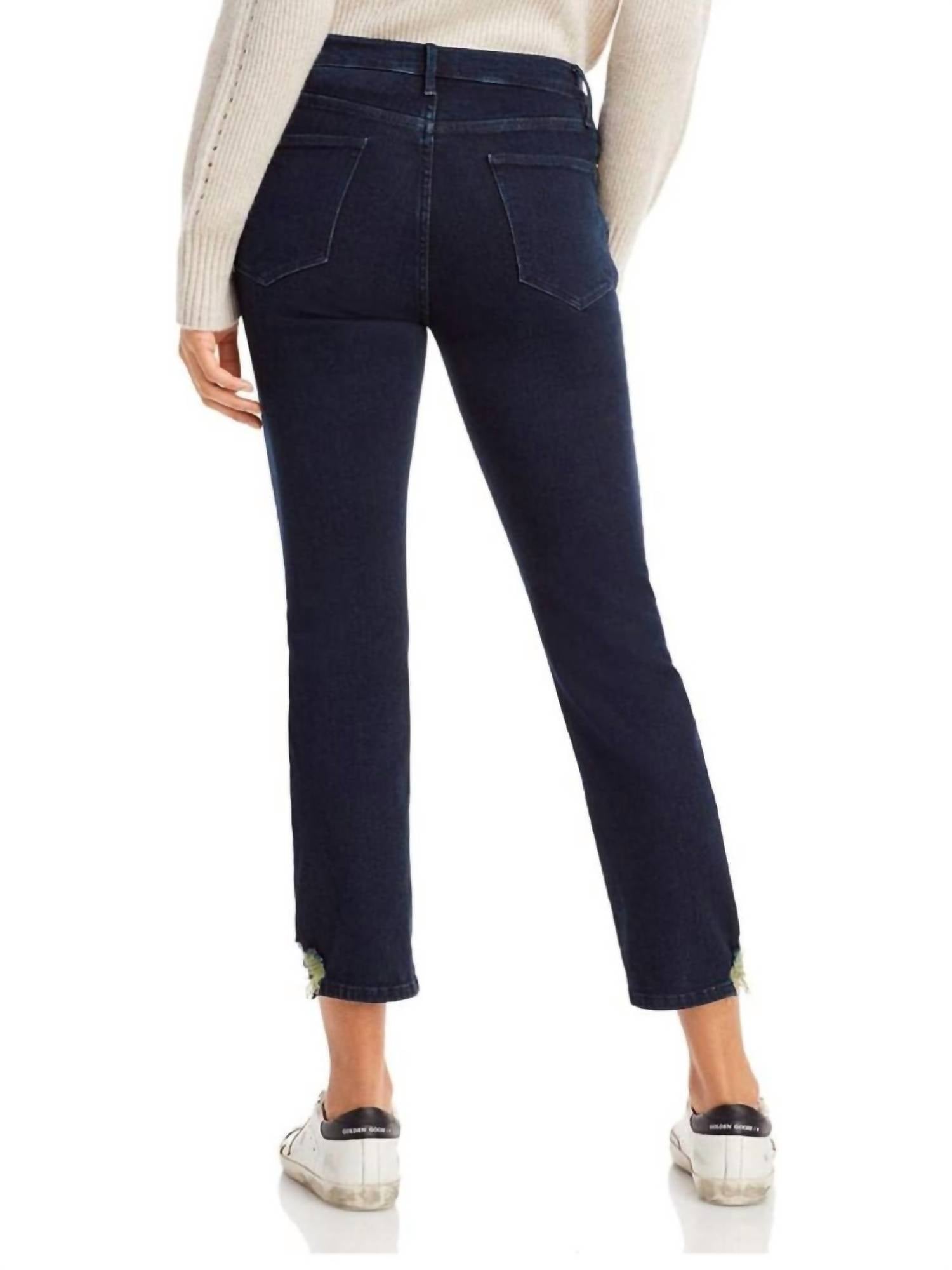 This classic straight leg jean has a perfect fit and goes with just about everything.Zip fly with button closure, five-pocket silhouette. Tonal stitching, gold-tone hardware, belt loops. Whiskered, destructed details at side hems. Straight-leg silhouette. 27" Inseam. Fits true to size. Model is 5'10" height, 33.5" bust, 23.5" waist, 34.5" hips, wearing a size 27. Machine wash cold. 94% Cotton, 4% Polyester, 2% Elastane.