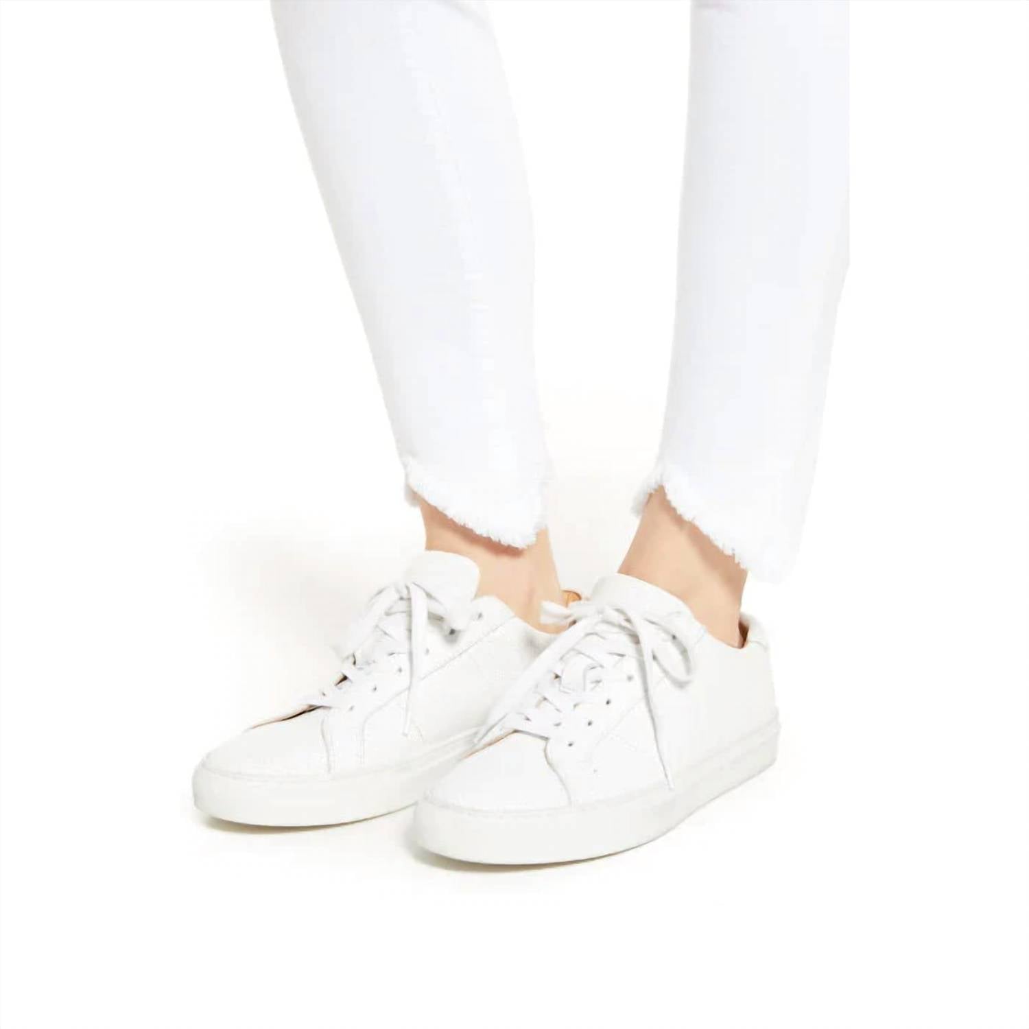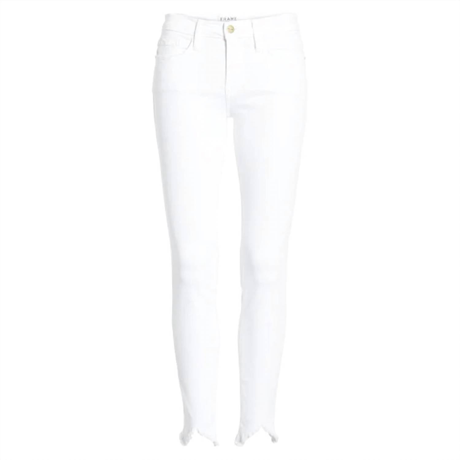 A skinny jean that is both flatering and comfortable. We love this style because it works great with boots, or without! These skinny jeans offer a flattering high-waist silhouette with a touch of stretch for added comfort. The zip fly with button closure and five-pocket style provide a classic look, while the unique triangle hem adds a distinctive detail. Crafted from 92% cotton, 6% polyester, and 2% elastane, these jeans are made from classic white denim. Machine wash cold. Measurements for size 29: 28" inseam, 10" leg opening, 10.5" front rise, 14" back rise.