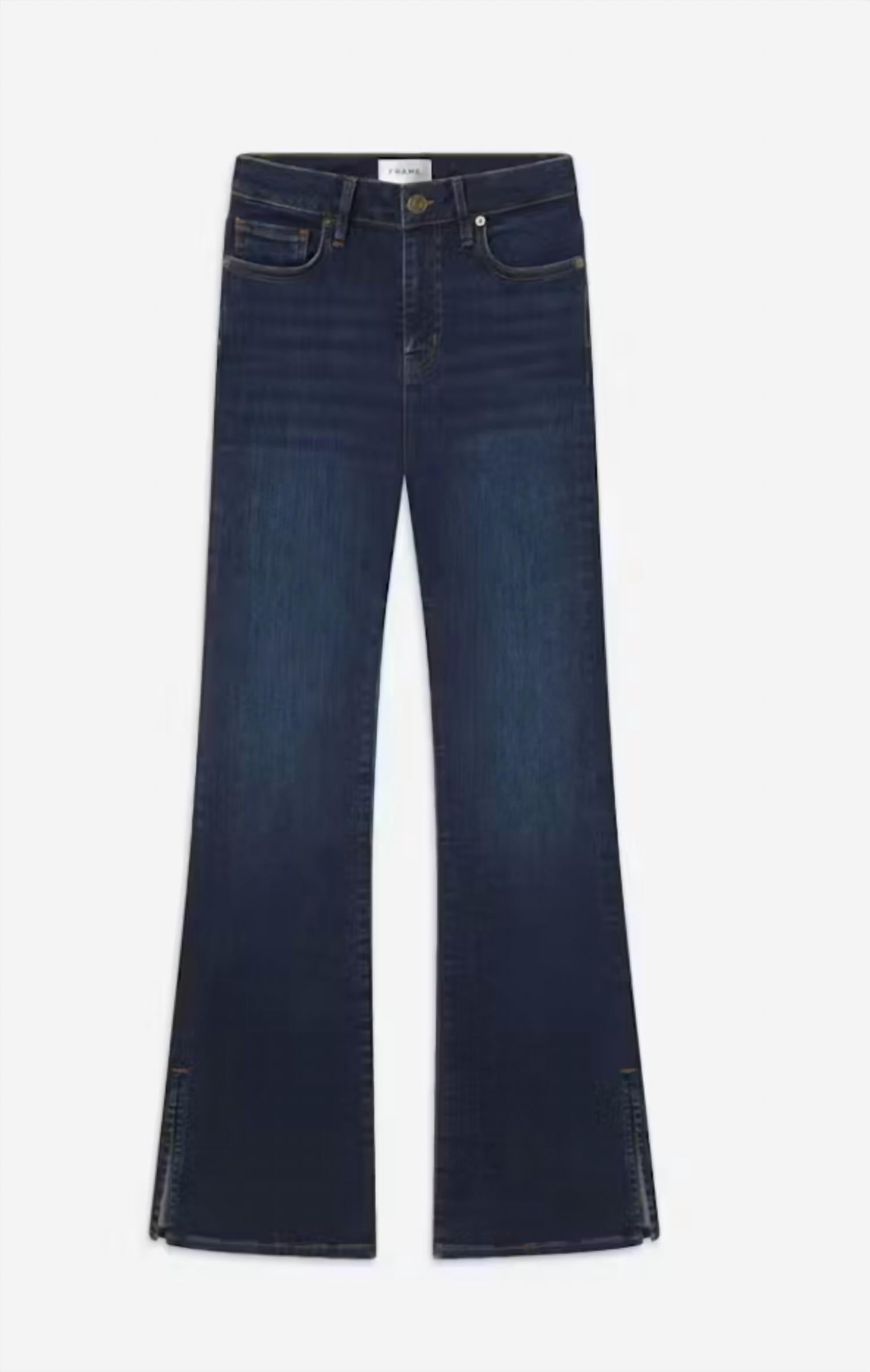 Fit to perfection, we love these high-waist jeans and you will too. Elevate your denim collection with the Le Mini Boot Jena Jeans by FRAME, crafted in a stylish Moonflower hue. These high-rise, regular fit jeans feature a flattering high-rise waist and a flared leg that tapers out from the knee into a slight kick with a chic outseam slit. Emphasizing sustainable fashion, they're enhanced by solid patterns and designed for streetwear style, perfect for your spring vacation wardrobe. Closure type: Button Closure.