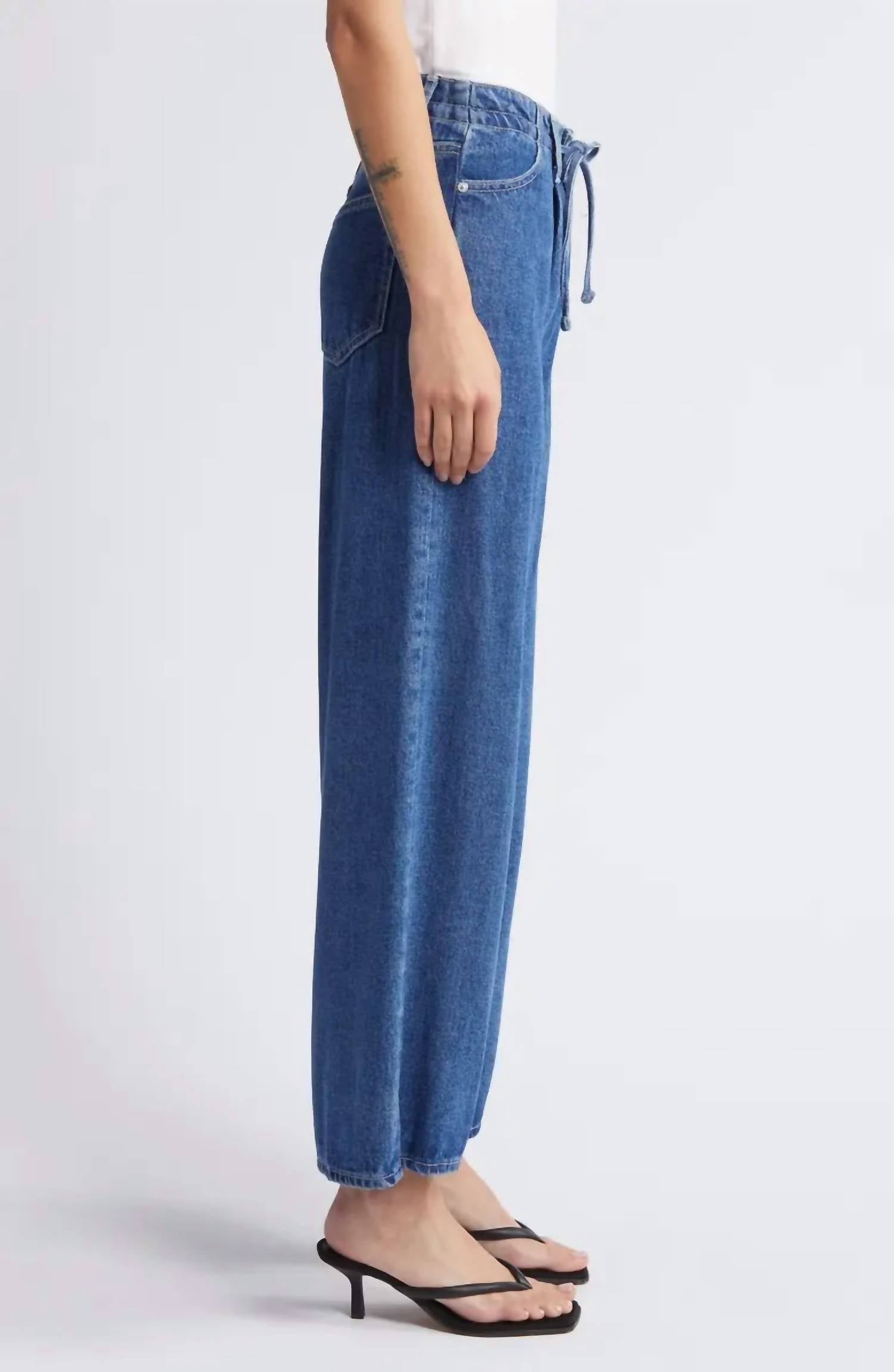 Meet the Pixie Drawstring Jeans by FRAME, crafted in a relaxed fit for effortless style. Made with 100% lyocell, these blue jeans feature a 27" inseam, wide leg with a 24" leg opening, and medium wash. The zip fly paired with a button closure and drawstring waist ensures a perfect fit, while the practical front scoop pockets and back patch pockets add functionality. Care: Machine wash and lay flat to dry. Imported.