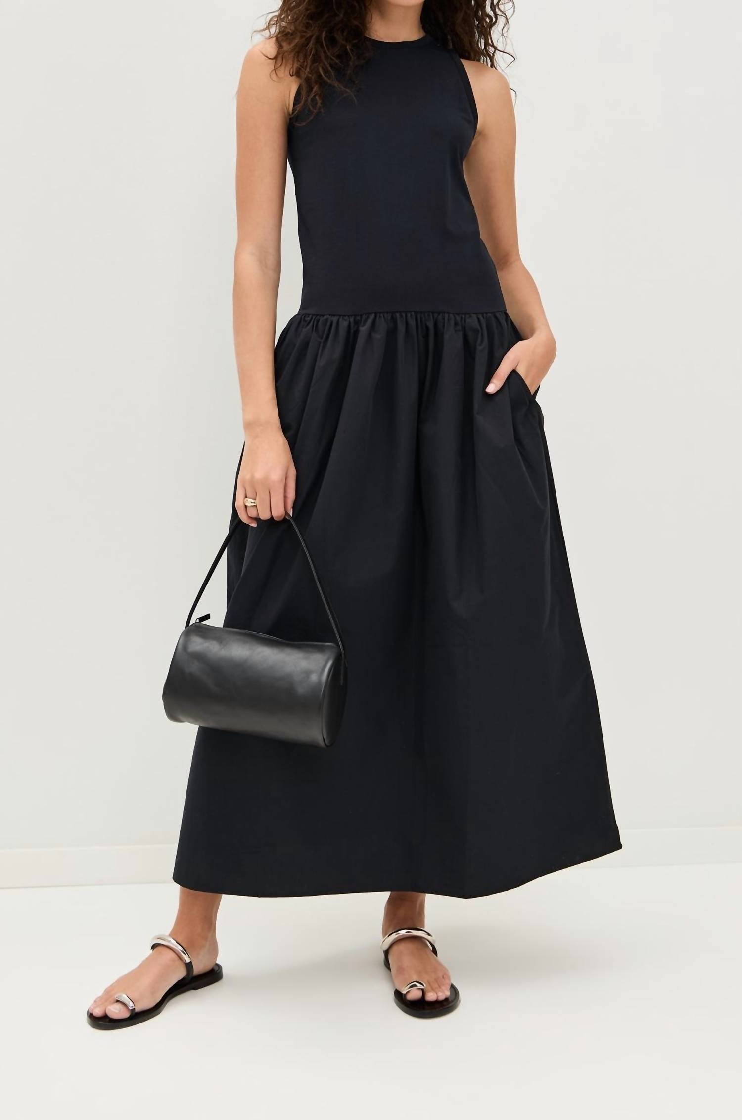 Introducing the Racer Tank Dress by FRAME, a chic addition to your wardrobe with a timeless Black hue. Sleeve Length: Sleeveless, Composition: 100% Cotton, Material: Lightweight, non-stretch poplin. This elegant maxi dress, made in Portugal, features a crewneck, gathered drop waist, and convenient on-seam side pockets, with a pullover design for easy wear. Garment Length: 53.5 inches. Care: Machine wash cold. This piece runs large, particularly in the waist and hips, making it perfect for a relaxed fit. Model is wearing a size XS (5'9" height).