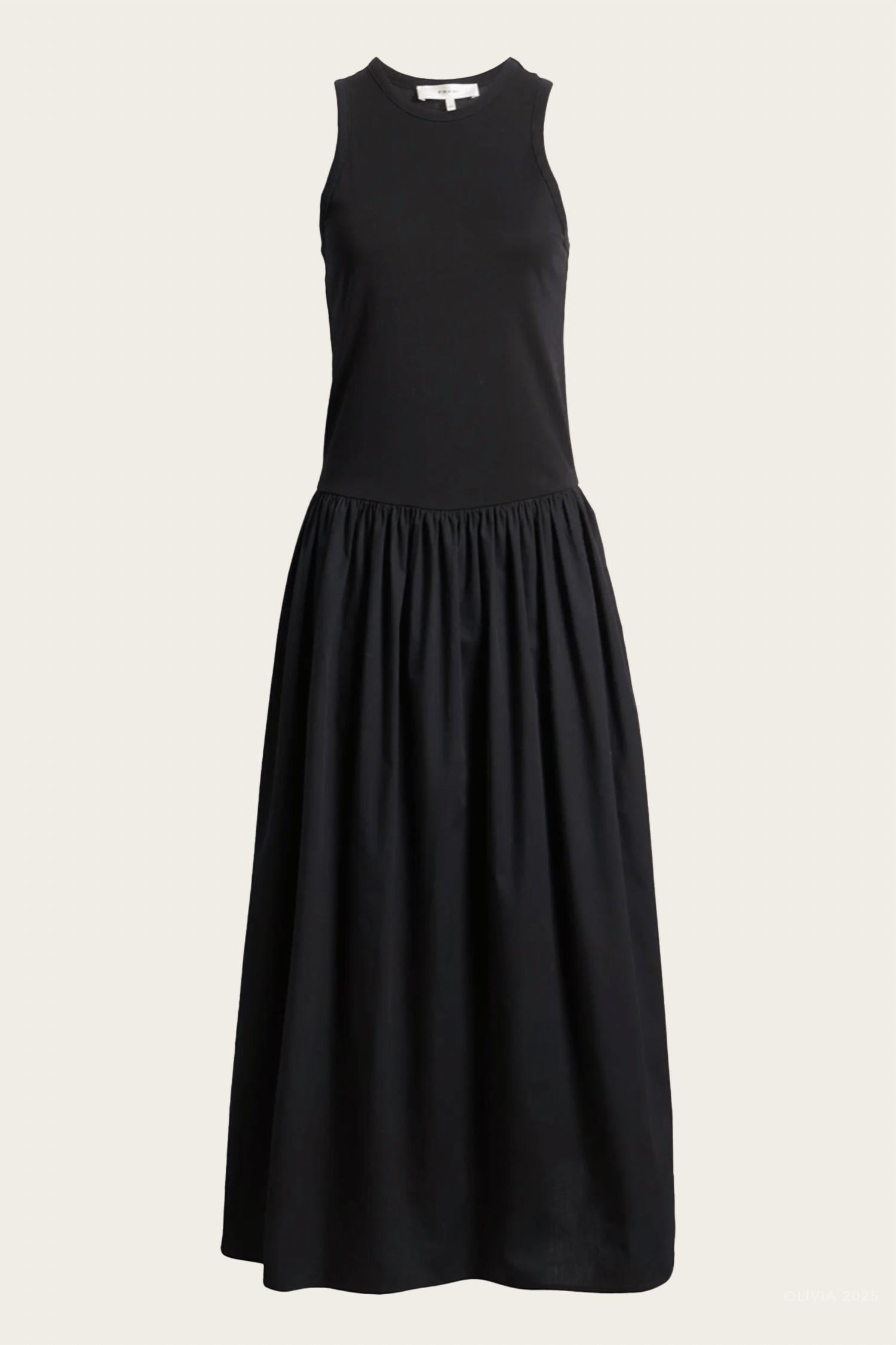 Style this maxi with your favorite statement necklace and sandals for the perfect look. Introducing the Racer Tank Dress by FRAME, a chic addition to your wardrobe with a timeless Black hue. Sleeve Length: Sleeveless, Composition: 100% Cotton, Material: Lightweight, non-stretch poplin. This elegant maxi dress, made in Portugal, features a crewneck, gathered drop waist, and convenient on-seam side pockets, with a pullover design for easy wear. Garment Length: 53.5 inches. Care: Machine wash cold. This piece runs large, particularly in the waist and hips, making it perfect for a relaxed fit. Model is wearing a size XS (5'9" height).