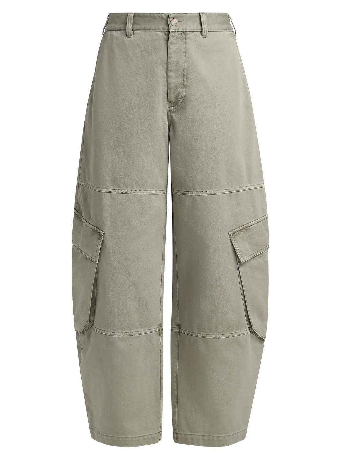 Upgrade your wardrobe with these cropped pants, designed to merge sophistication and wearability. The tailored fit ensures ultimate comfort during long days or nights out. Introducing The Bubble Cargo Pants by FRAME in sophisticated Rosemary, ideal for the stylish traveler or streetwear enthusiast. These high-rise, relaxed-fit pants are composed of 100% cotton, ensuring comfort and breathability. They feature a zip fly with button closure and a rounded wide-leg silhouette, complete with functional side flap and back patch pockets. With a rise of about 11.125" and an inseam of about 29", these pants are easy to care for with machine wash instructions.