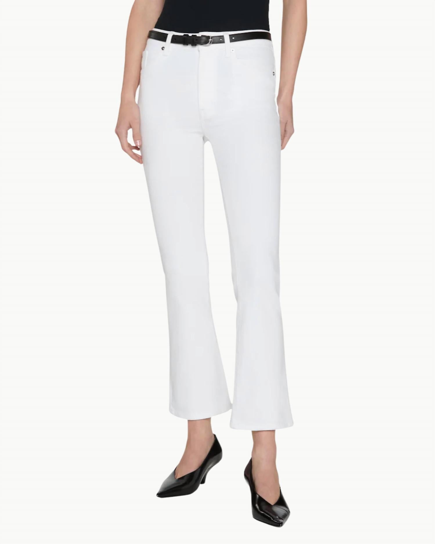 Slightly flared pants are all the rage right now and these are no exception. Pair these with your favorite tee for a more casual look, or with your favorite button-up blouse for an evening out. Elevate your wardrobe with FRAME's Reboot Crop Jean, a sophisticated choice in a solid white hue. These women's bootcut jeans feature a relaxed fit and cropped inseam that finishes just above the ankle, perfect for a preppy spring style. Expertly crafted from a stretchy blend of 57% regenerative cotton, 38% rayon, 3% elasterell-P, and 2% elastane, they ensure comfort for all-day wear. Dimensions include an 11" front rise, 27" inseam, and a 17" leg opening. Closure: Button closure. Care: Machine wash and tumble dry.