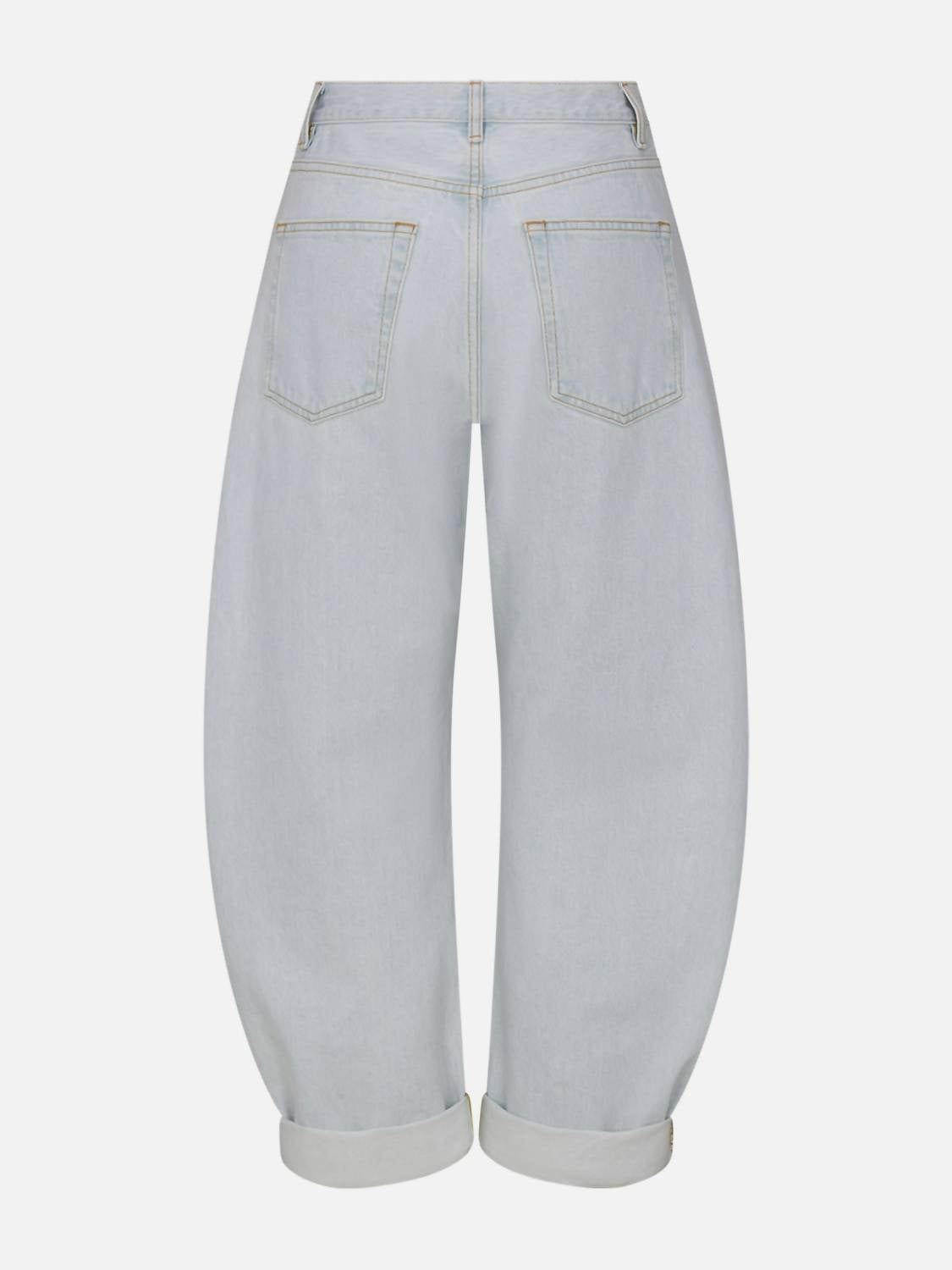Pair these wide leg jeans with mules, slides or your favorite strappy sandals. Introducing the Women's The Bubble Jean by FRAME, a standout piece for your summer wardrobe in the vibrant Cardiac color. These jeans feature a flattering wide leg style with a solid light wash that encapsulates streetwear trends, perfect for vacation occasions. Equipped with practical pockets and a convenient zip closure, these jeans effortlessly combine style and functionality. Crafted specifically for women, this piece exemplifies FRAME's dedication to quality and modern design.