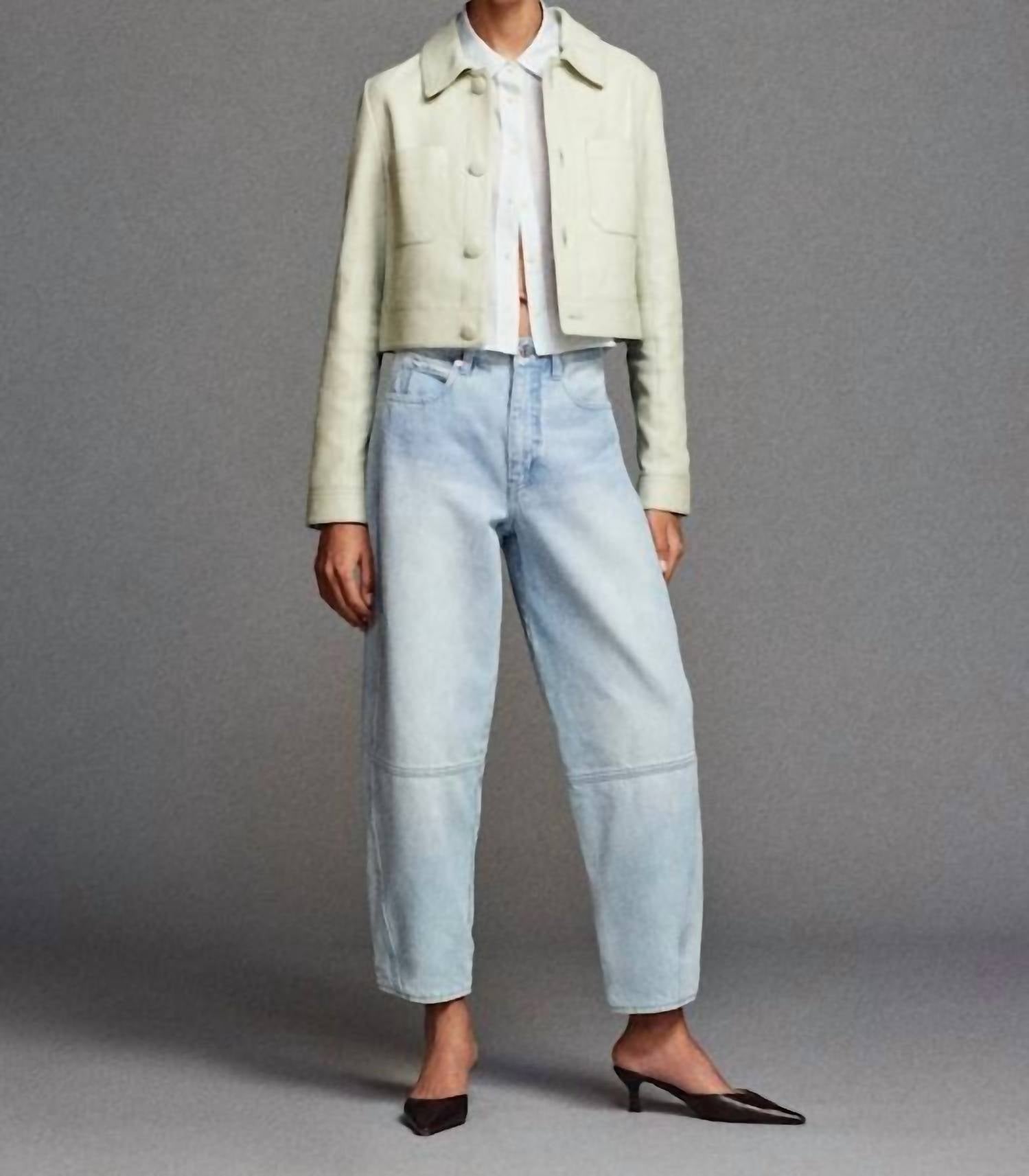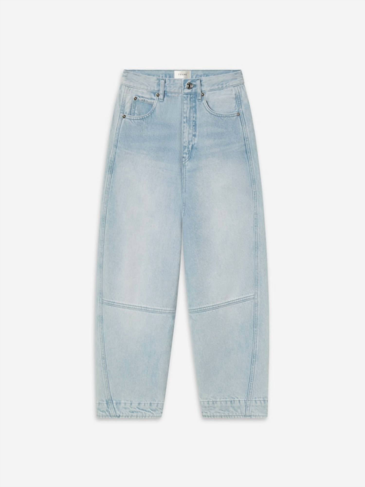 The Women's The Twisted Jeans by FRAME are designed for streetwear-inspired summer vacations. These stylish jeans feature a chic stripe pattern and a wide leg style, perfect for a relaxed yet fashionable look. They come in a light wash 'Never' shade and include convenient pockets. Closure: Zip closure. Care instructions are not specified.