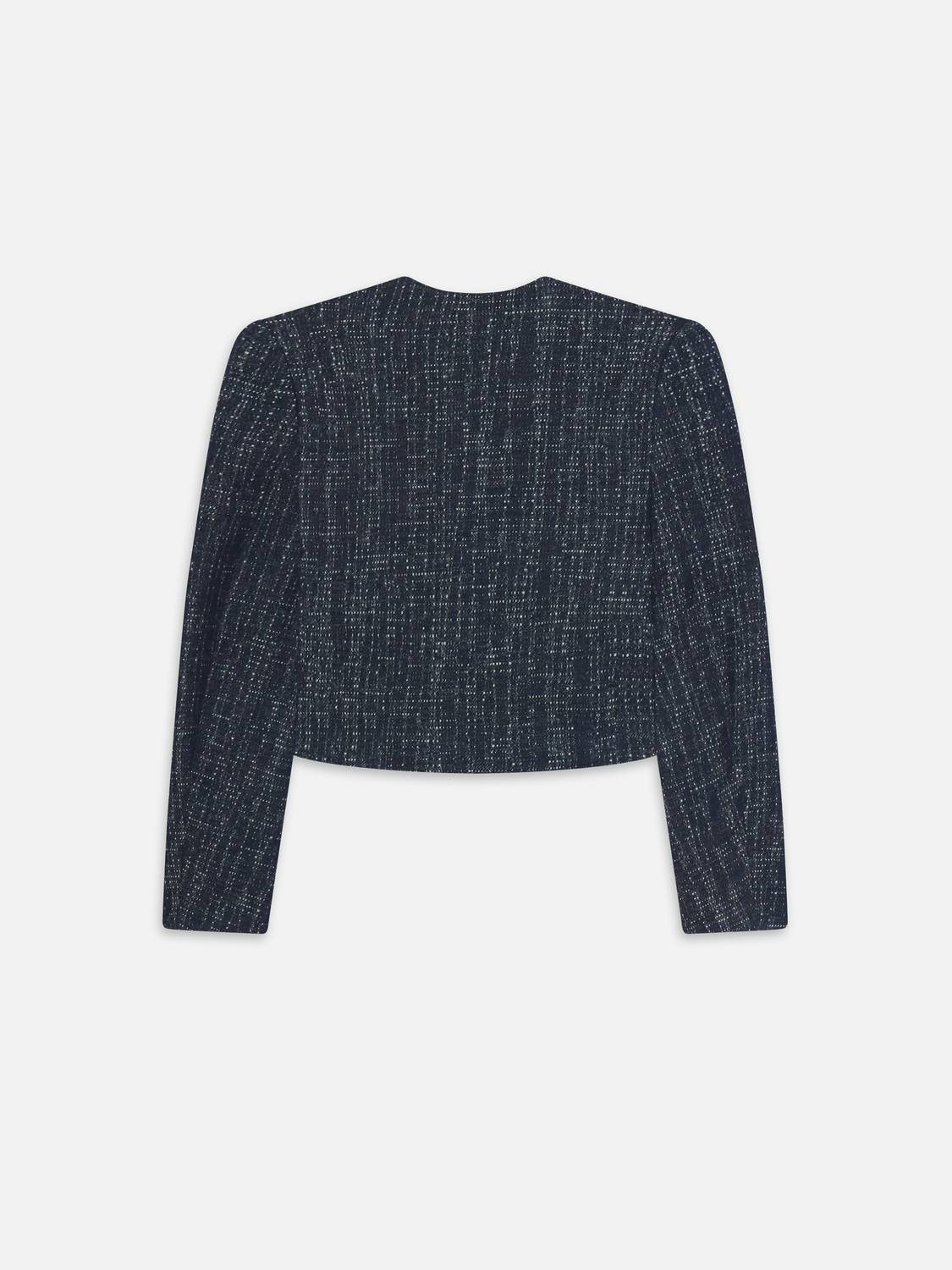 Cute, casual, and comfortable. This jacket is a must have. Meet the Women's Tweed Jacket by FRAME, a chic wardrobe staple in indigo designed for the minimalist trendsetter. This casual piece features long sleeves and a textured pattern, crafted from 100% cotton with a sleek crewneck that completes its refined silhouette. Its cropped, boxy design is accented with gold button closures, offering a polished yet versatile look. Care: Dry clean only.