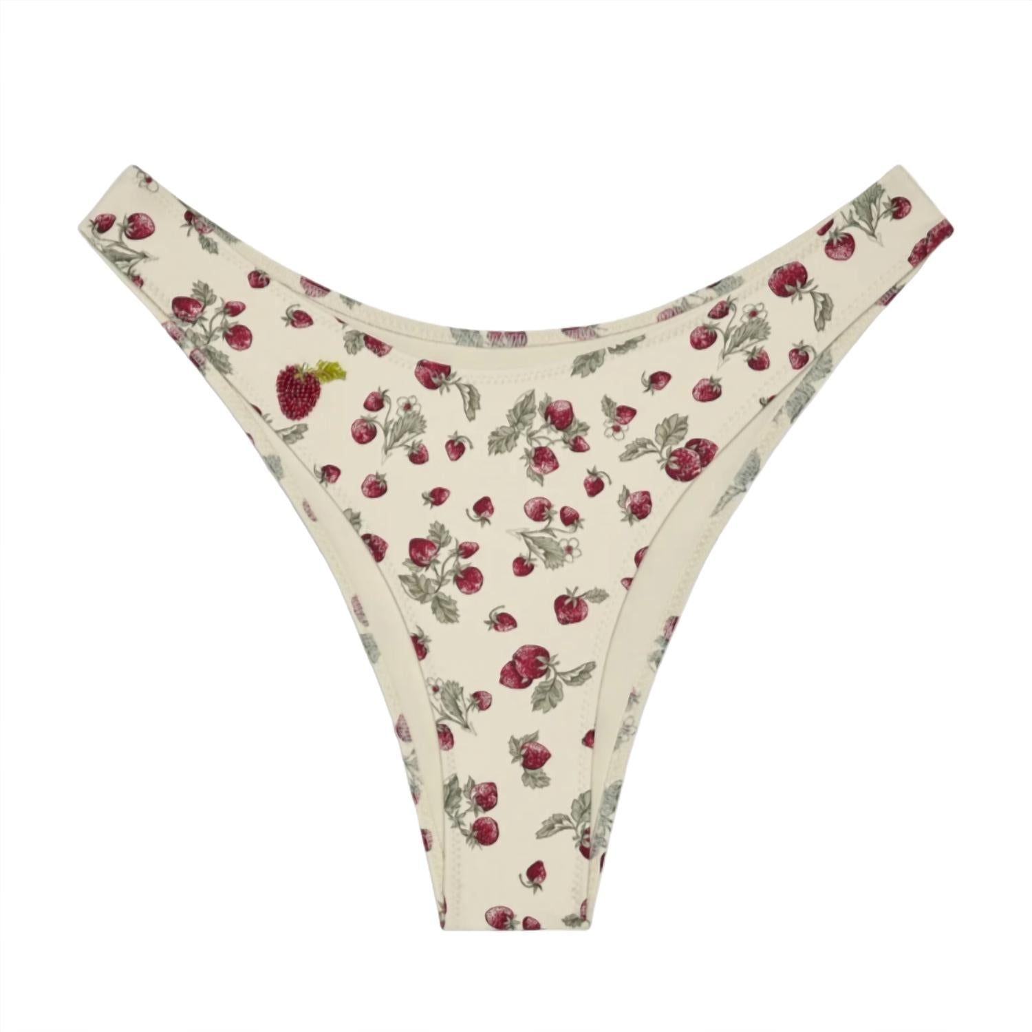 Ideal for relaxed poolside moments, this adorable swimsuit effortlessly transitions into the perfect sunset dinner outfit when paired with a flowing skirt. Elevate your vacation wardrobe with the Women's Dove Bikini Bottom from Frankies Bikinis, showcasing a patterned design in a vibrant Strawberry Field color. This cheeky bikini bottom offers a flattering cut and classic coverage, embodying effortless beach style with a boho chic trend. Fully unlined, it provides a simplistic and sleek silhouette perfect for spring adventures. Please note that specific care instructions are not provided, so handle with care to maintain its longevity.