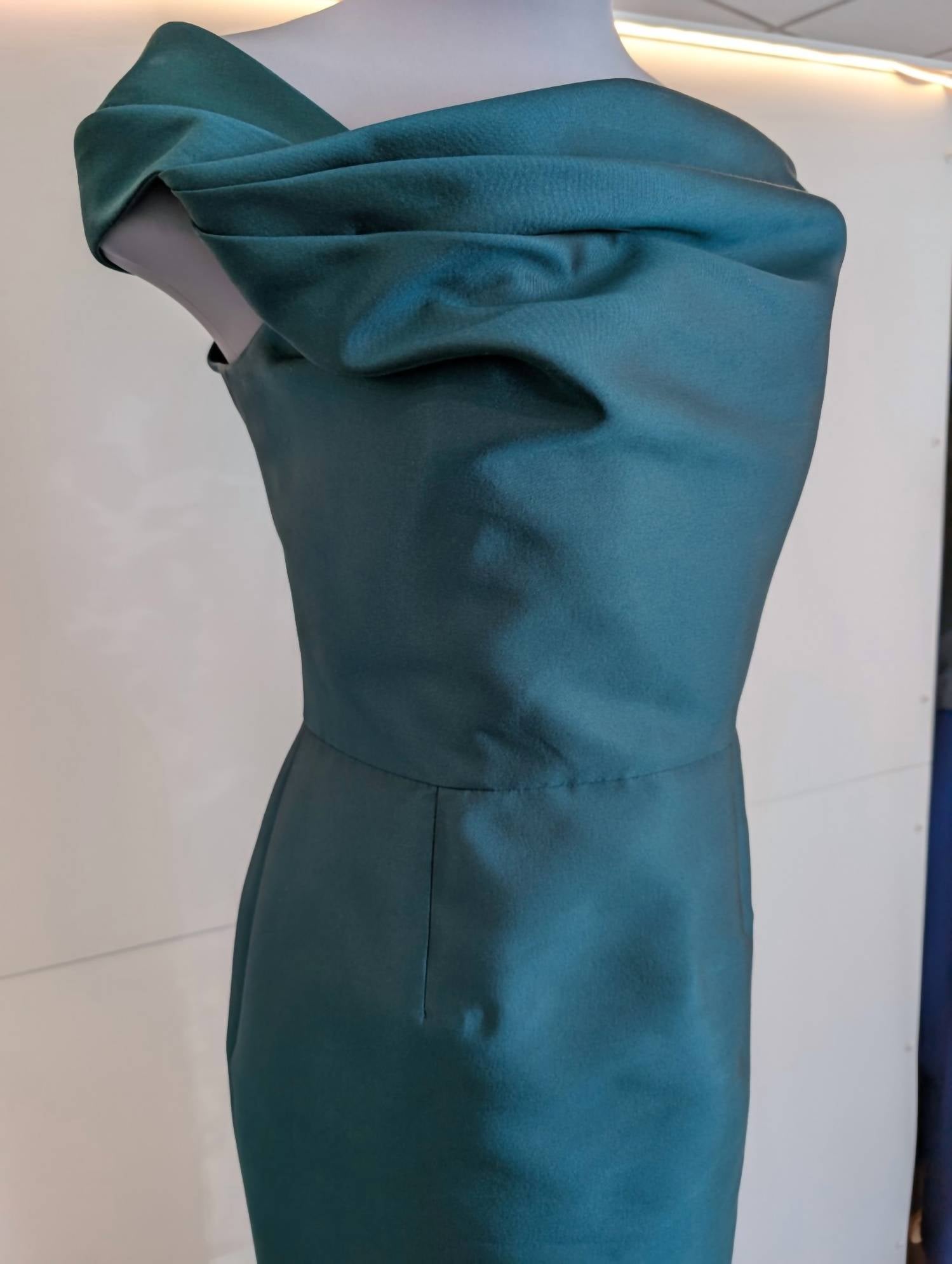 Elevate your occasion wear with the Off the Shoulder Mother of the Bride Gown by FRASCARA, an elegant piece in a stunning teal hue. This sheath dress, made from a luxurious silk wool blend, features an asymmetrical draped bodice and a sophisticated column skirt silhouette with a back vent for ease of movement. Crafted in Canada, the gown boasts a hidden back zip closure for a seamless finish. For optimal care, ensure dry cleaning.