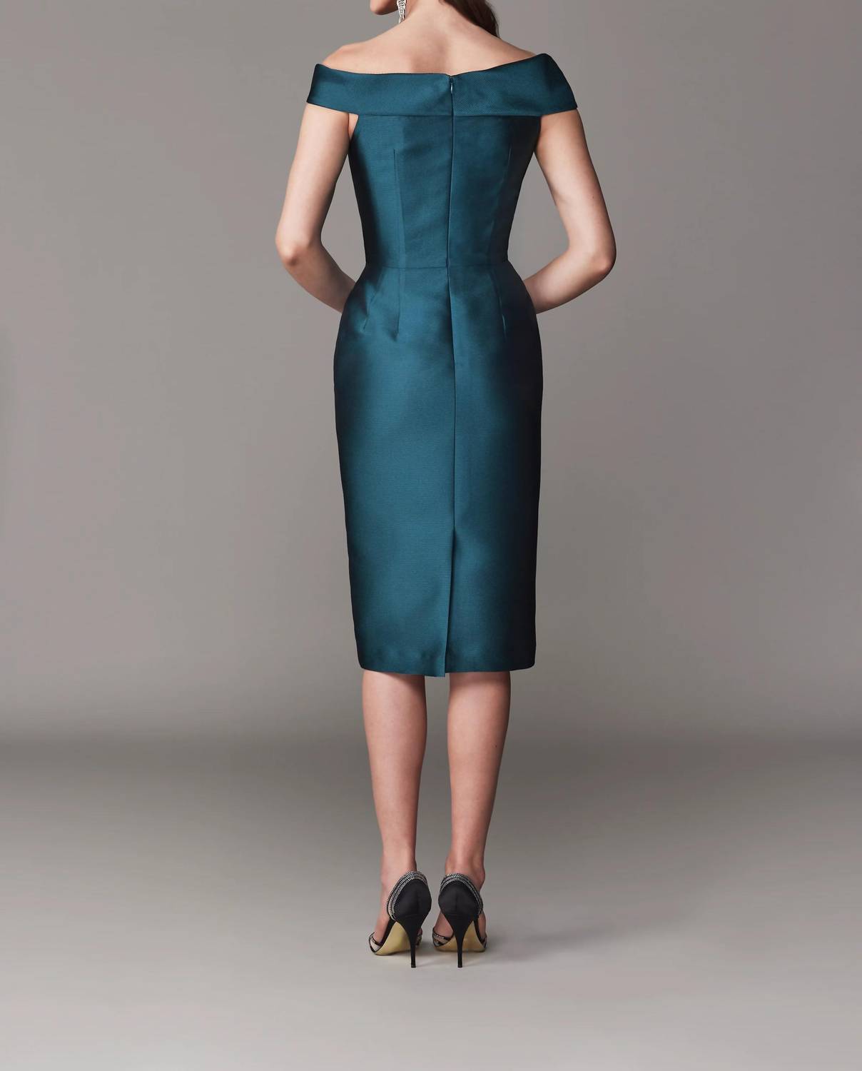 A midi dress so versatile, your options for wearing it are endless. Elevate your occasion wear with the Off the Shoulder Mother of the Bride Gown by FRASCARA, an elegant piece in a stunning teal hue. This sheath dress, made from a luxurious silk wool blend, features an asymmetrical draped bodice and a sophisticated column skirt silhouette with a back vent for ease of movement. Crafted in Canada, the gown boasts a hidden back zip closure for a seamless finish. For optimal care, ensure dry cleaning.