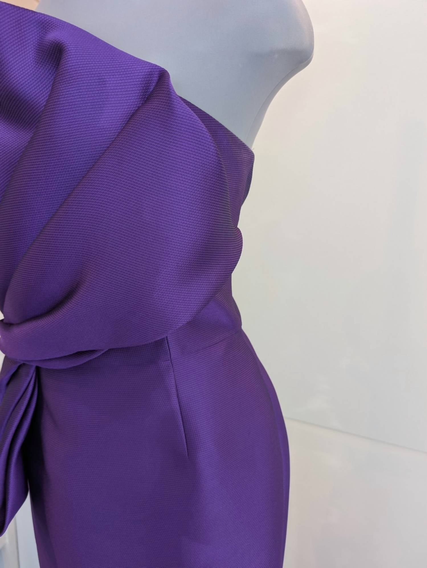 The pefect strapless dress for those warmer months. Add a cardigan for those cooler summer nights. Elevate your occasion wardrobe with the Strapless Mother of the Bride Silk Wool Gown by FRASCARA, a stunning creation in Ultra Violet. This gown features a sophisticated bodice with asymmetrical draping and a peplum detail, complemented by a fit and flare skirt silhouette. Crafted from a luxurious silk wool blend, it includes a hidden back zip closure for a flawless finish. The gown is satin lined and requires dry cleaning to maintain its elegant allure.