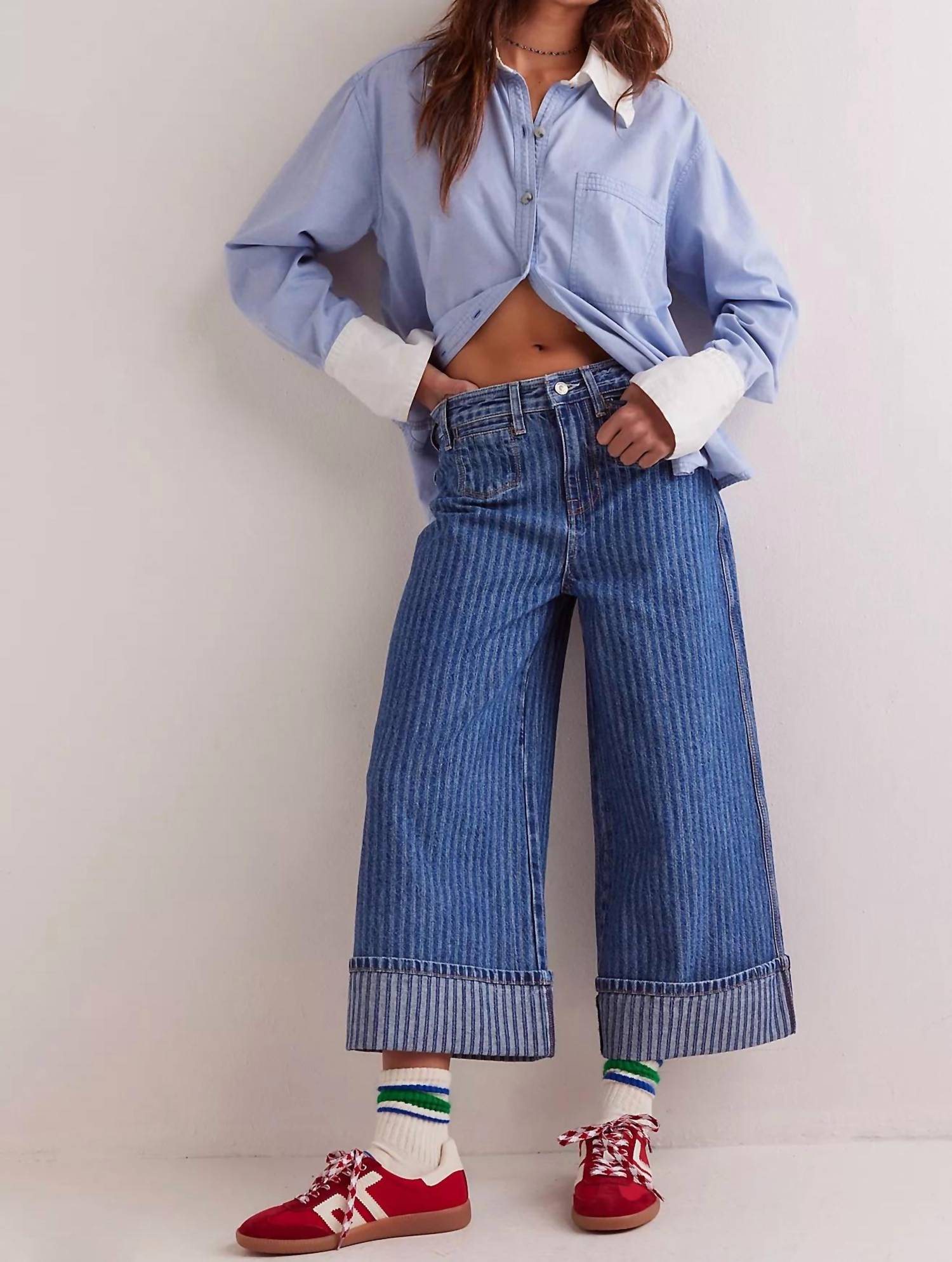 Elevate your denim collection with the Brette Cropped Wide-leg Jeans by Free People, featuring a bold striped pattern in Bittersweet Blue. Crafted from 100% cotton, these mid-rise jeans offer a wide-leg, cropped silhouette with a 26.25-inch inseam and a 12-inch rise. Designed with a classic five-pocket style, button closure, and washed stripe fabrication, they are versatile enough to pair with court sneakers or ballet flats. Care for these jeans with ease: simply machine wash cold and tumble dry.
