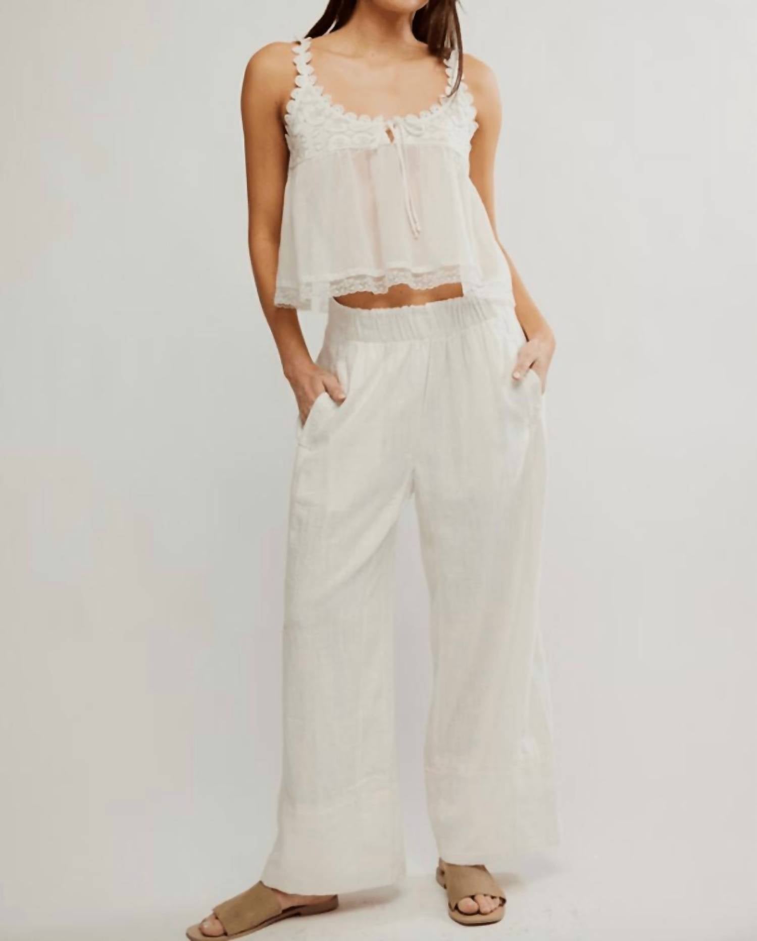 The Days End Linen Pull On Pants by Free People are crafted in a Linen Blend, offering a relaxed fit that exemplifies comfort and versatility. These white, wide-leg pants feature a solid pattern and a convenient button closure, making them ideal for transitioning from casual outings to more polished occasions. Embrace the effortless style perfect for summer with included pockets for extra functionality.